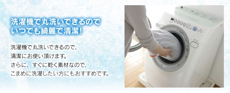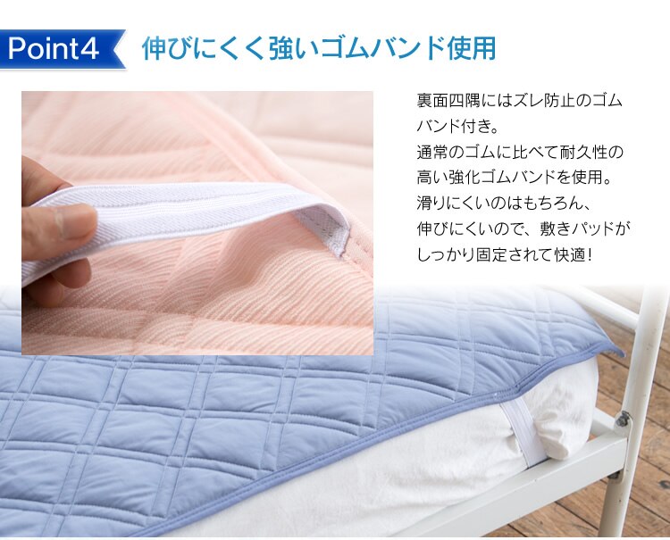 裏面四隅にはズレ防止の固定用強化ゴムバンドを使用。お手持ちの敷布団、ベッドマットレスに簡単に装着、取り外しできます。 ご家庭で洗濯が可能なので、いつでも清潔にご使用できます。