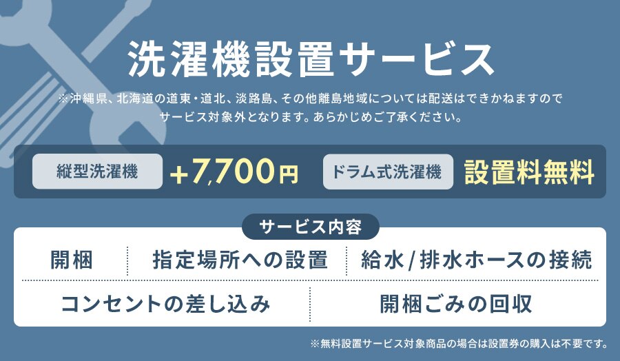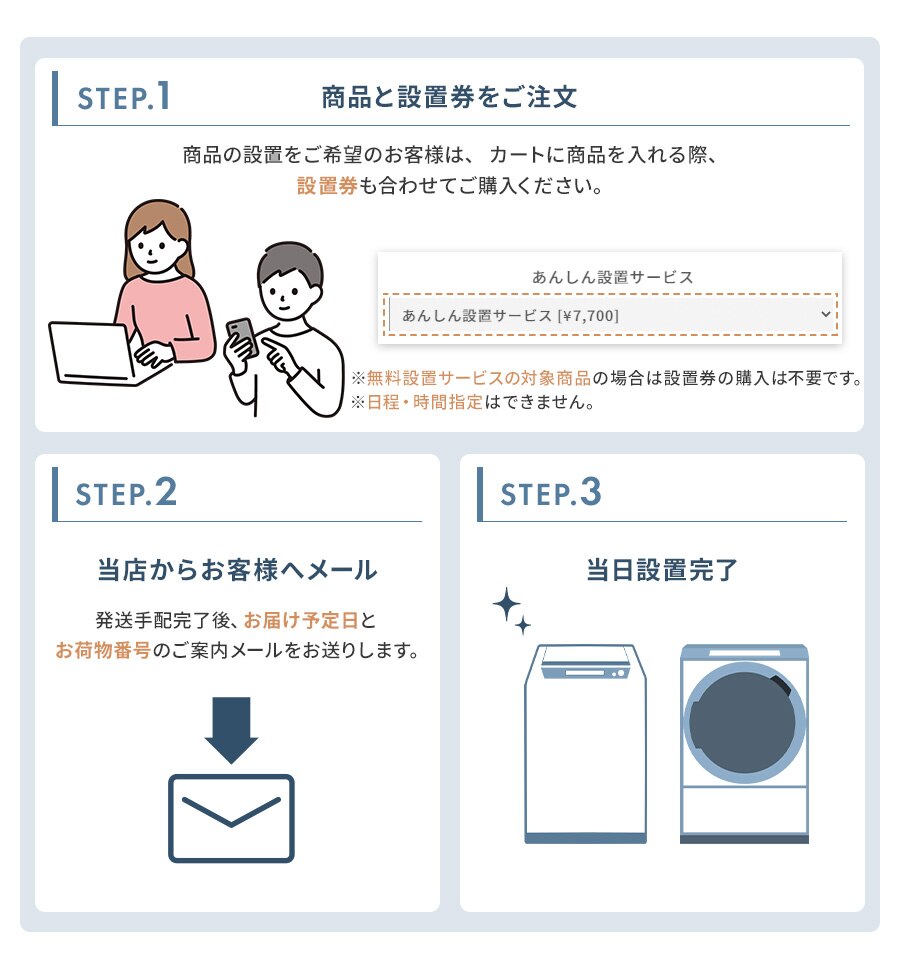 「あんしん設置サービス」は商品のお届け後、開梱・指定場所への設置・給水/排水ホースの接続・開梱ごみの回収までを代行するサービスです。