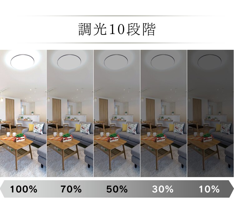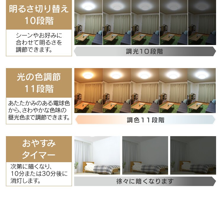 調光10段階+調色11段階+常夜灯2段階に調節ができます。