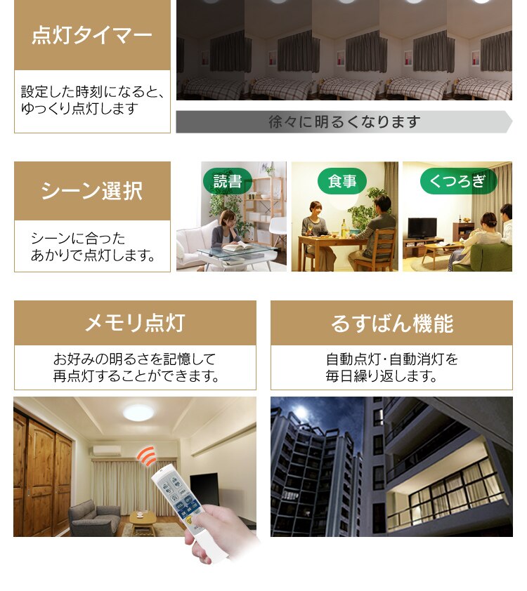 設定された明かり(読書・食事・くつろぎ)が再現され、シーンに合わせて明かりを演出します。