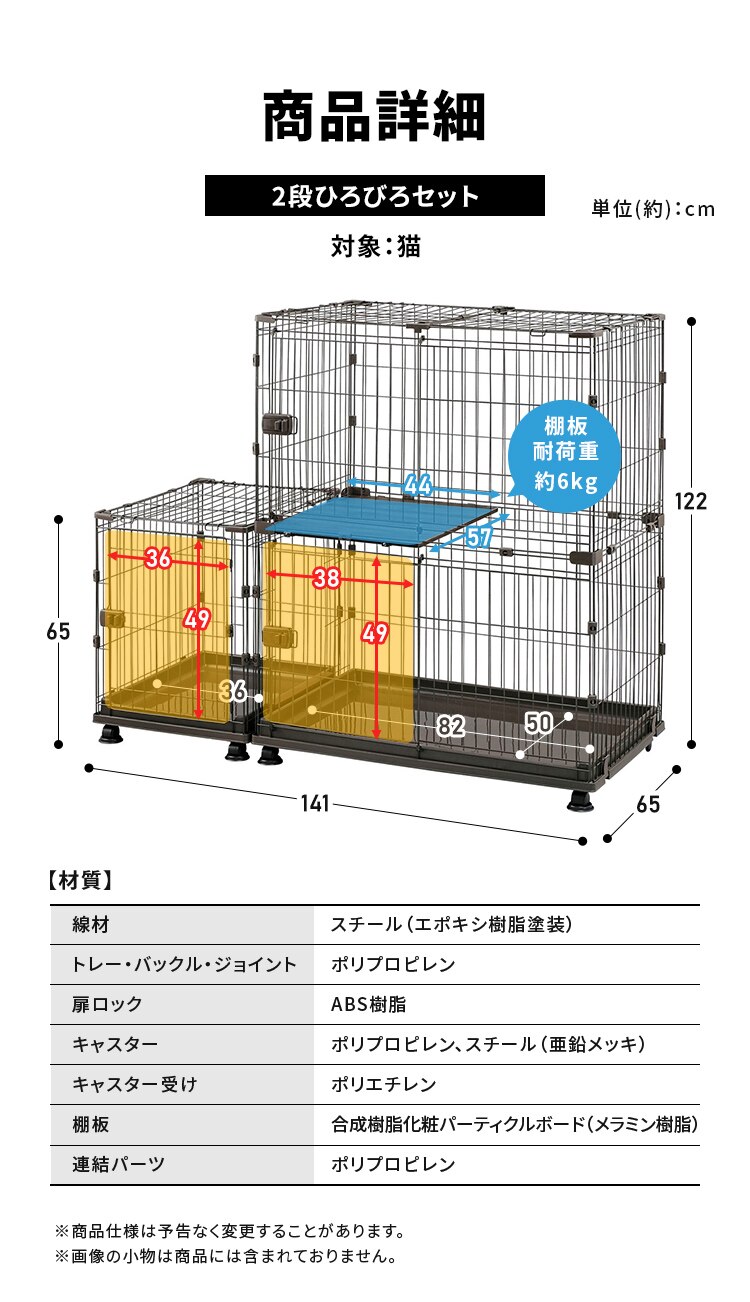 - 子猫(2ヶ月)をお迎えする際に購入しました。子猫には大きすぎるかとも思いましたが、大型種で体が大きくなることを考慮してこちらを選びました。現在4.5kgありますが広々使えてとても快適そうです^^ 大きめのトイレが置けるのもとても良いです!ただステップ1つだと下から登るのに高い気がして、追加でもう1つステップ購入しました。とても頑丈ですし、キャスターがついてるので掃除もしやすくオススメです。