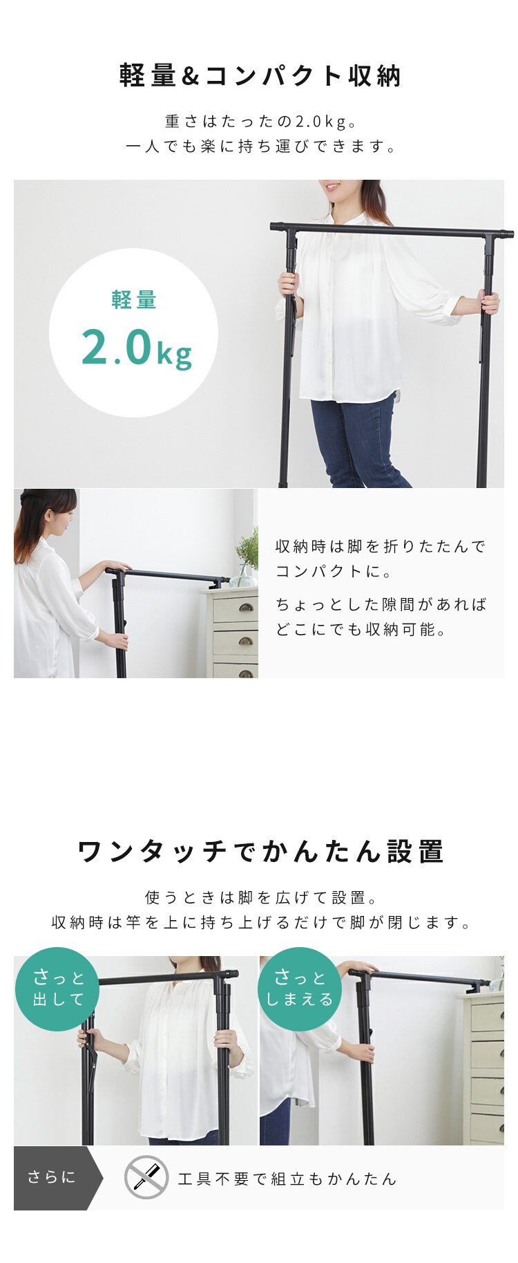- 雨の日に、コンパクトで脱衣所に置いて洗濯物をかけて乾かすのに、重宝してます。