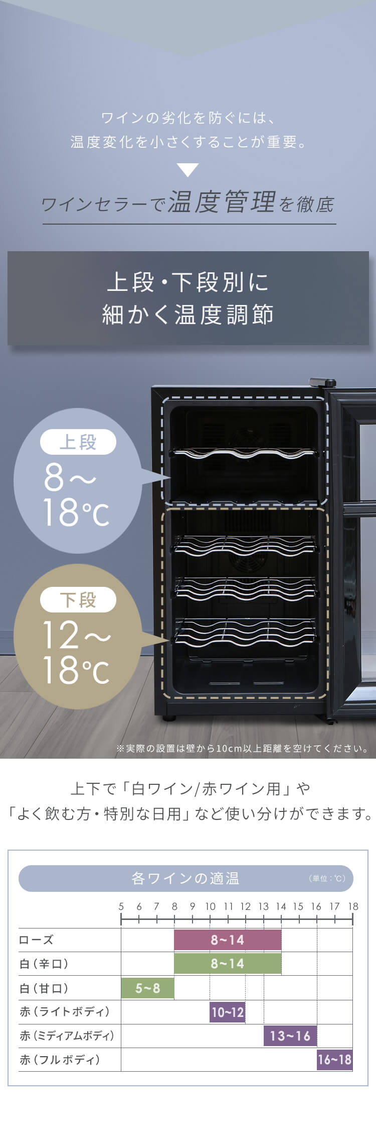 - ペルチェタイプなので音も気にならず、温度も一定に保てるので、先に小型のワインセラーを購入後に、サイズが大きなタイプを購入。2台のワインセラーに、ワインの種類ごとに温度管理をしています。特に家庭用なら場所も取らず、2種の温度に設定できるのが良いです。