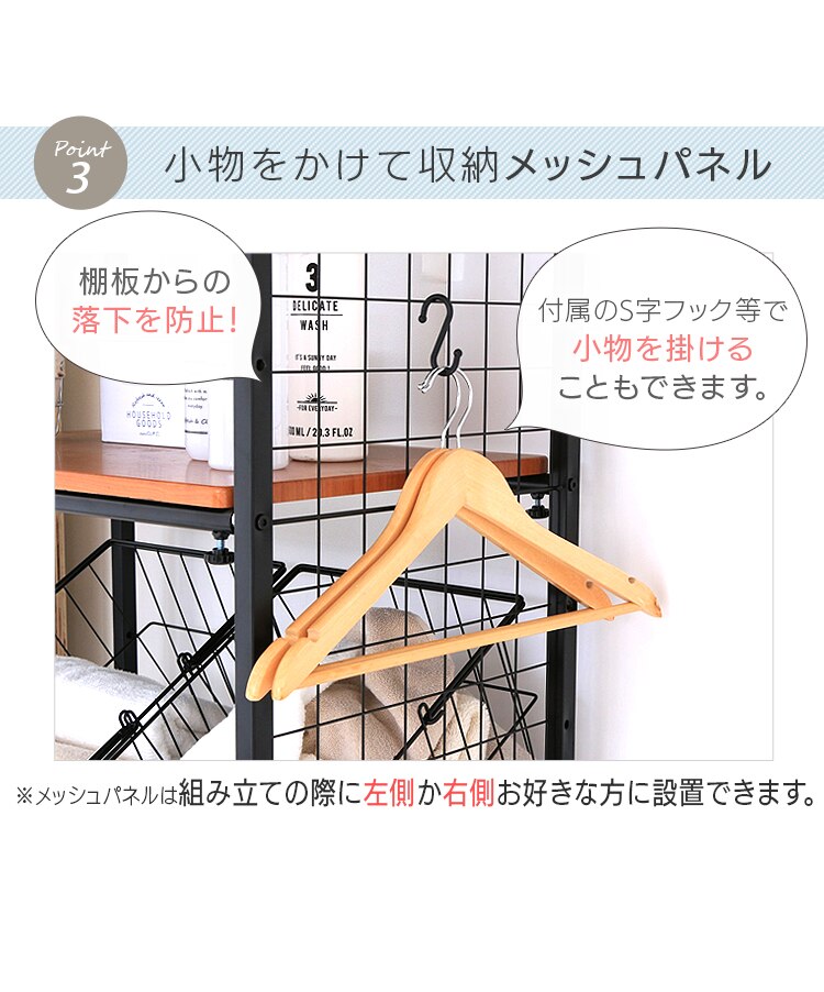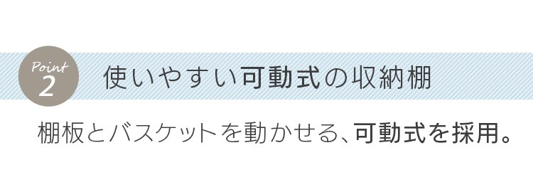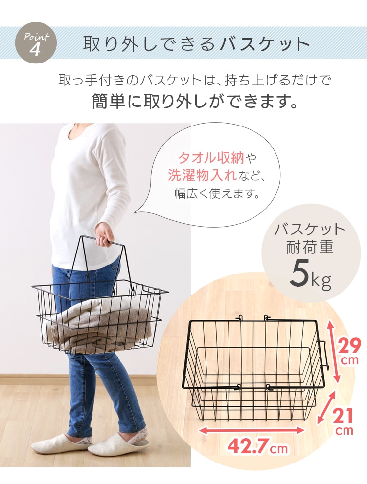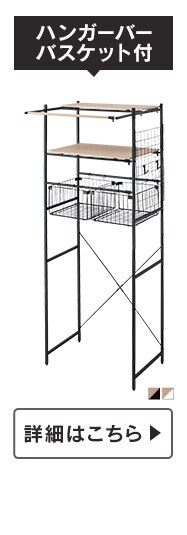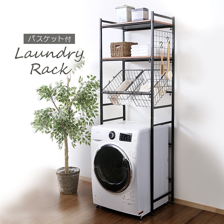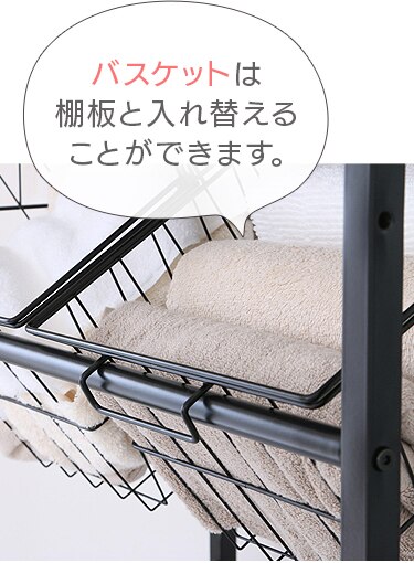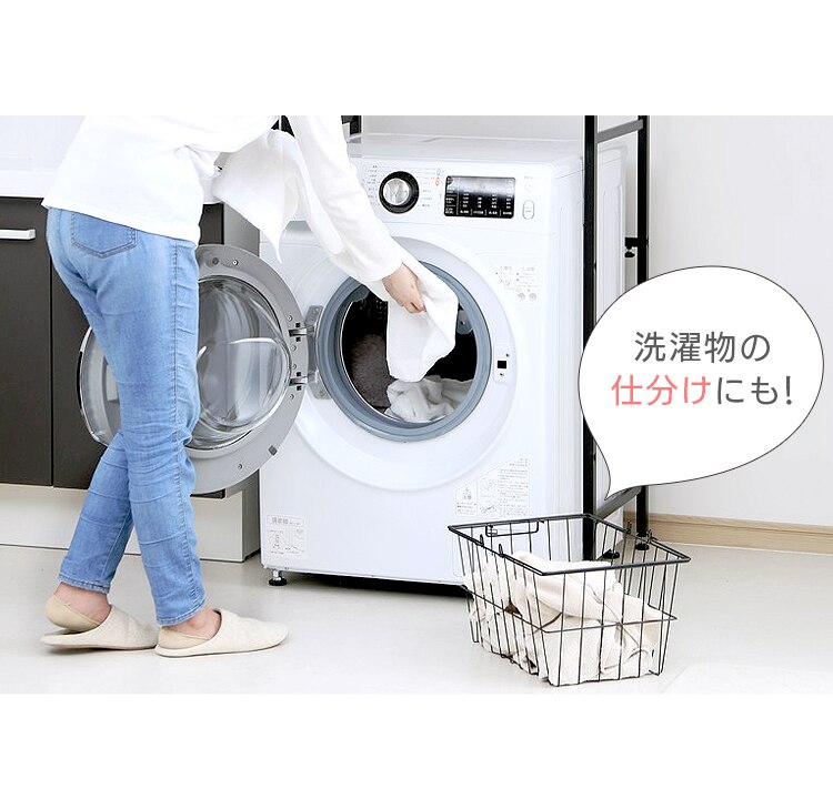 横幅の調節ができるバスケット付きランドリーラックです。