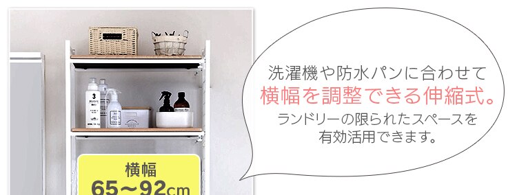 横幅約65〜92cmの伸縮タイプでお家の洗濯機に合わせて設置が可能です。