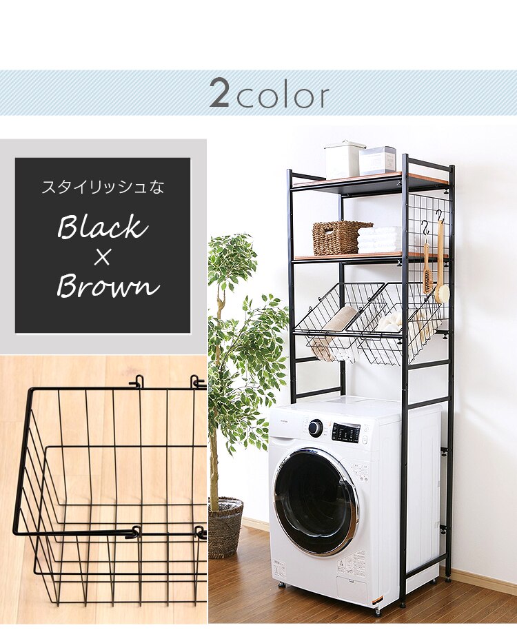 - とにかく洗濯機上のデッドスペースが、カゴや棚のおかげで使いやすい空間になりました。欲を言えば、棚のブラウンが濃いめのダークブラウンだったらもっと良かったけど、