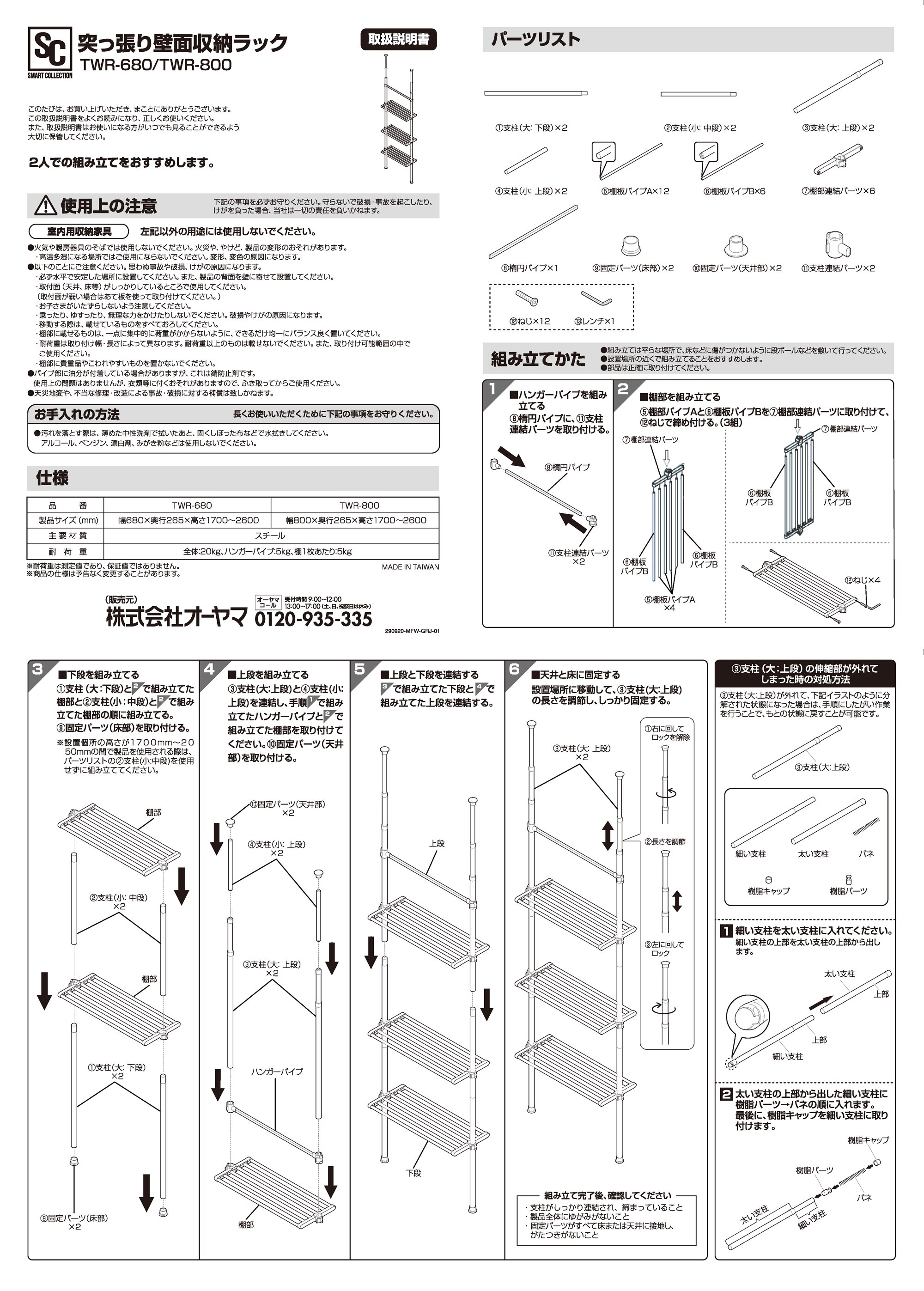 - 突っ張り壁面収納ラック TWR-800 ワイド/ホワイト