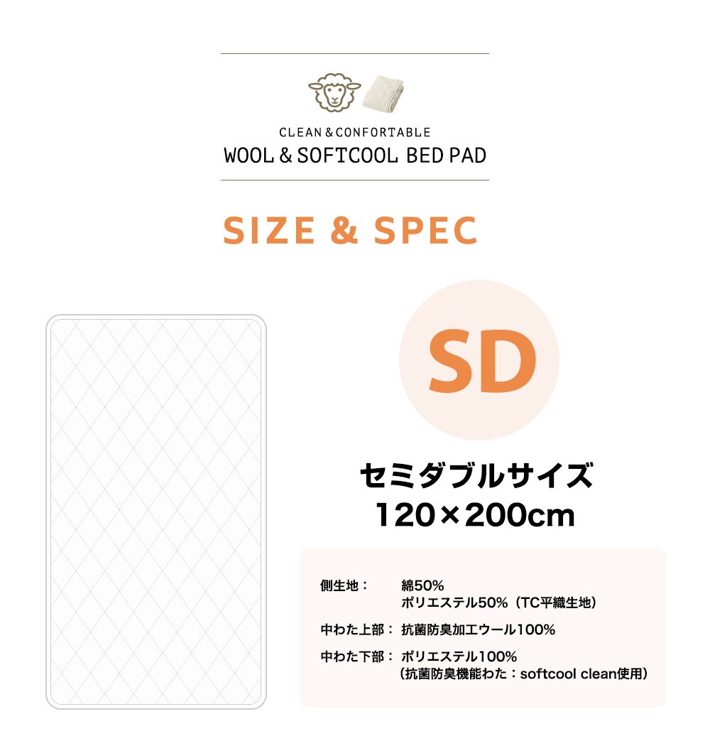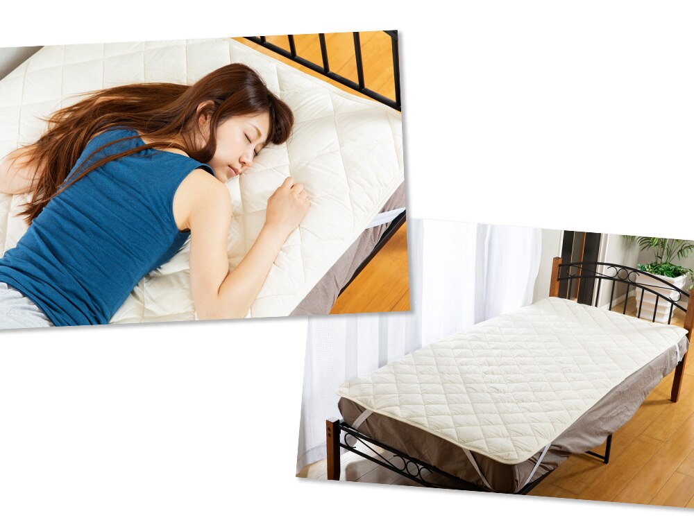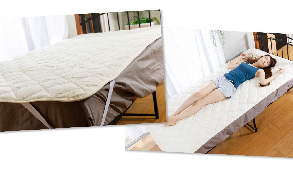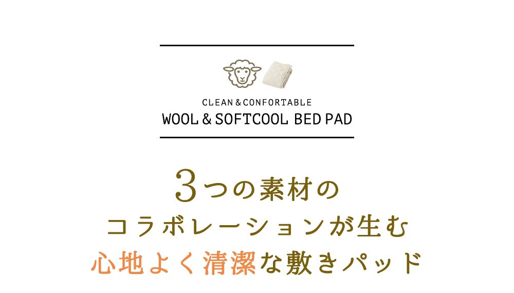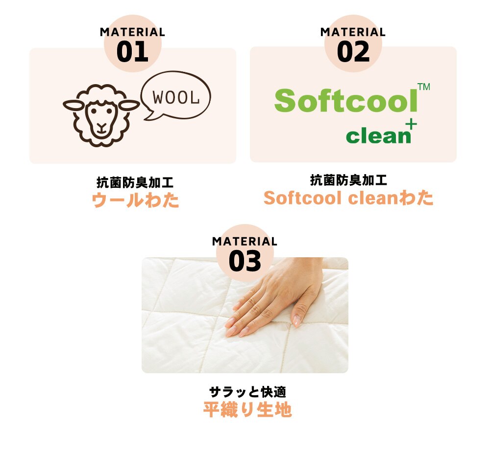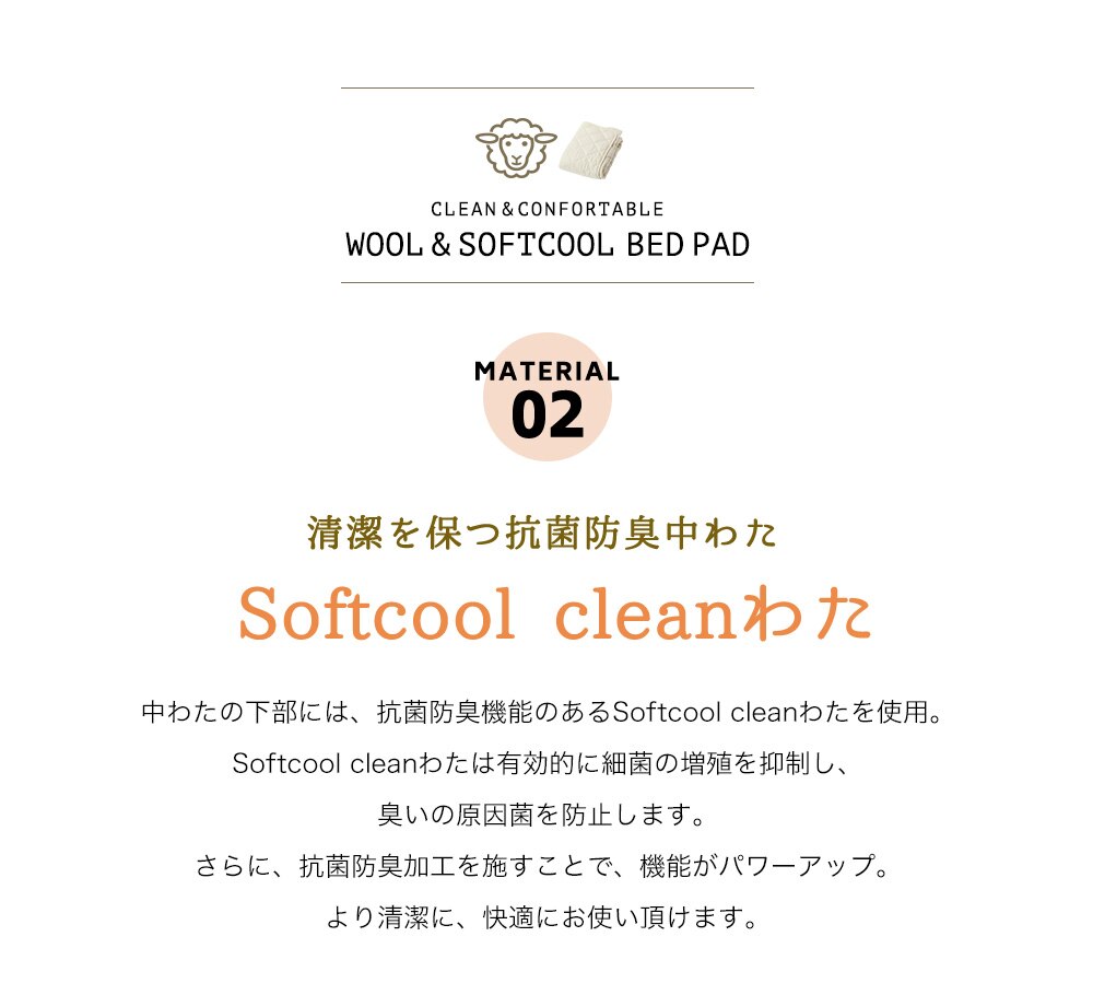 中わたに抗菌防臭機能のあるSoftcoolわたとウールわたを使用した、ダブル効果で清潔で衛生的な敷きパッド。