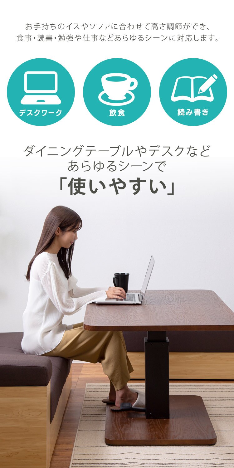 立ったまま作業をしたり、イスの高さに合わせて昇降することができます。