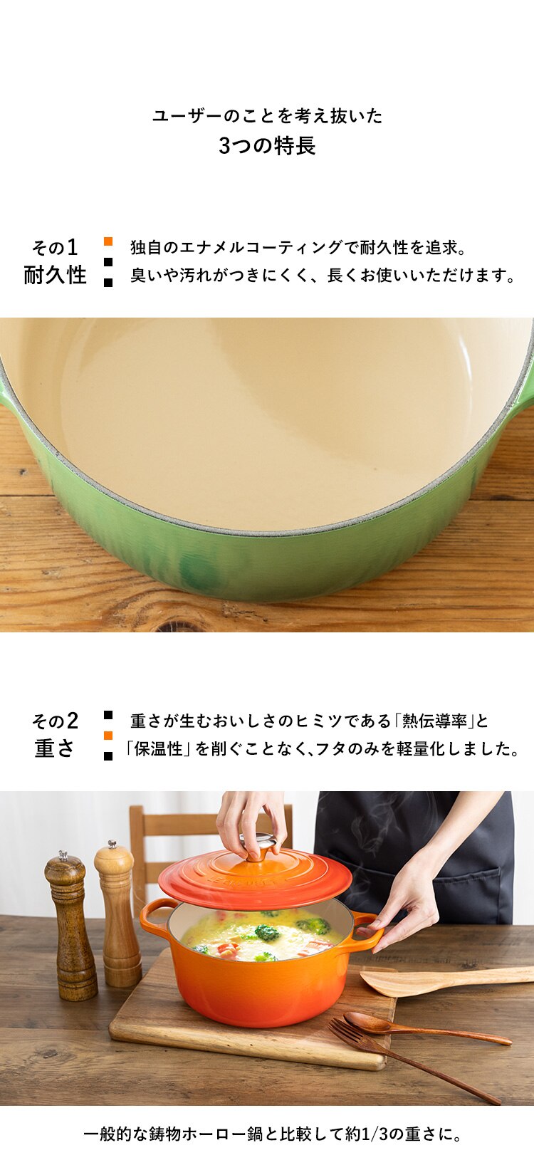 独自のエナメルコーティングで耐久性を追求、臭いや汚れが付きにくく、長くお使いいただけます。