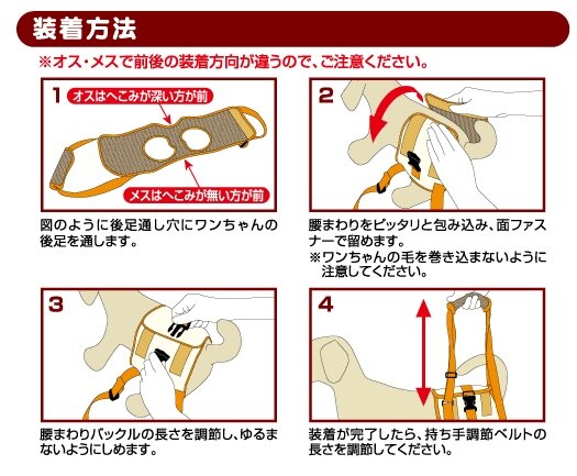 装着したままでもオス・メス共に排せつ可能。面ファスナーとワンタッチバックルで簡単に着脱出来ます。
