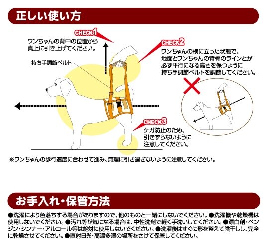 - 装着は割合簡単でいいのですが、どうしても後ろ足だけを宙に引っ張り上げるようになりがちで、我が家では首輪からの紐と一緒に3点持ちで歩かせると具合がいいようです。とはいえ、これにより寝たきりがちだった老犬が歩けるようになったので感謝しています。