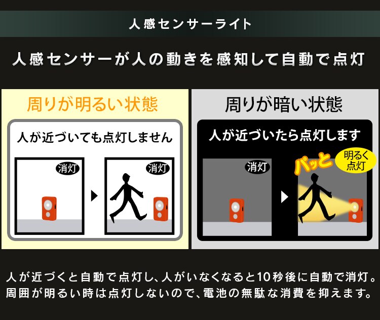 人が近づくとパッと明るく光るので、玄関・トイレ・ベッドサイド・クローゼット・階段・廊下などに最適です。