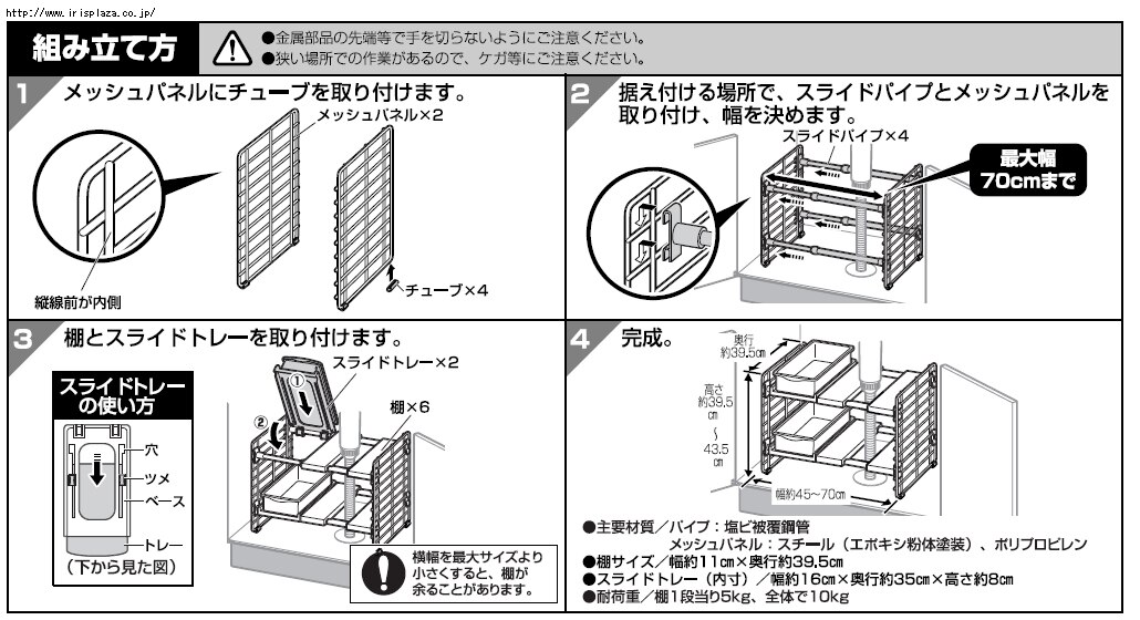 ※棚板は合計6枚付属しています。最大幅70cmでご使用の場合、スライドトレー+棚板4枚で棚幅約60.5です。
