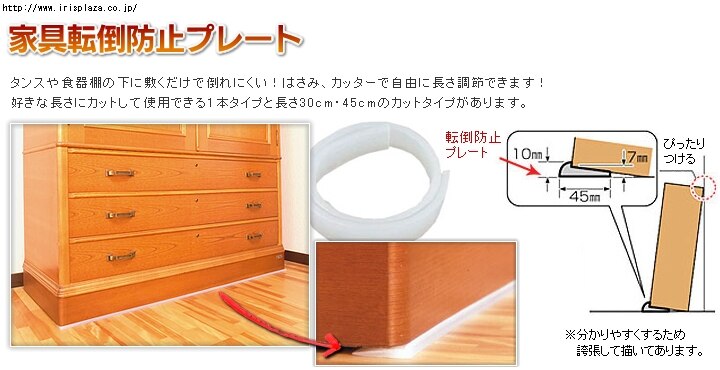タンスや食器棚の家具類の下に敷くだけで倒れにくくする家具転倒防止プレートです。ハサミやカッターでカットが出来るので長さを自由に調節できます。