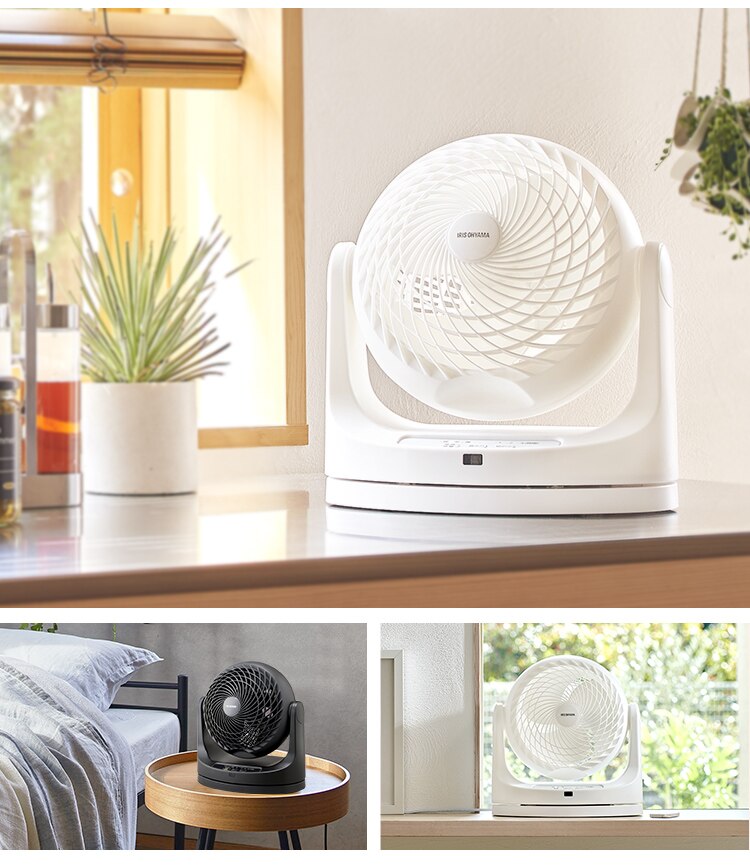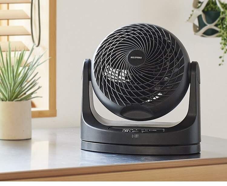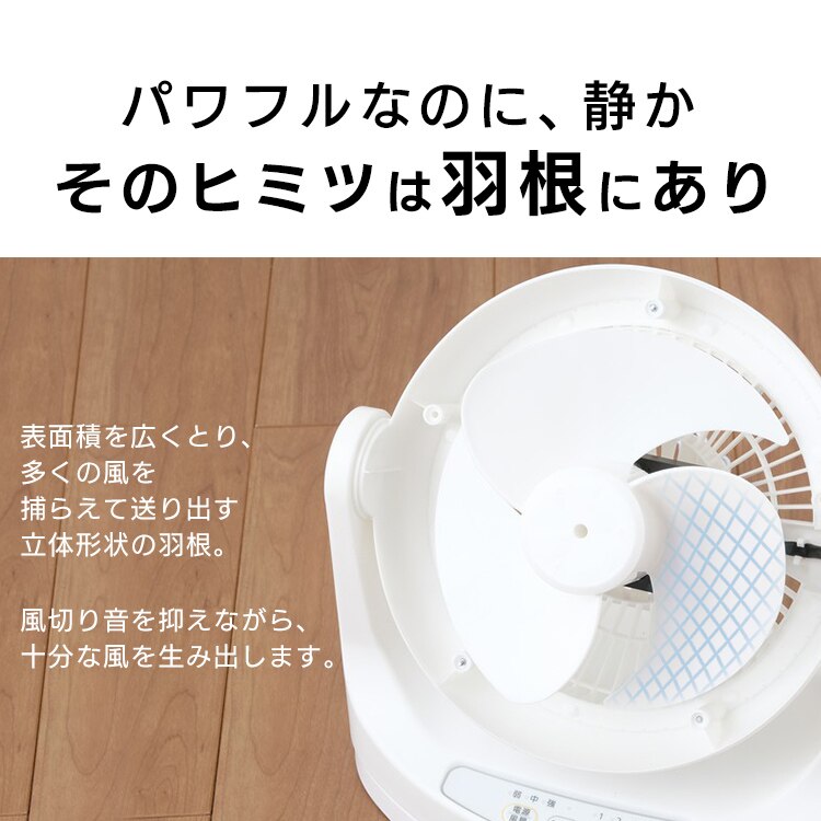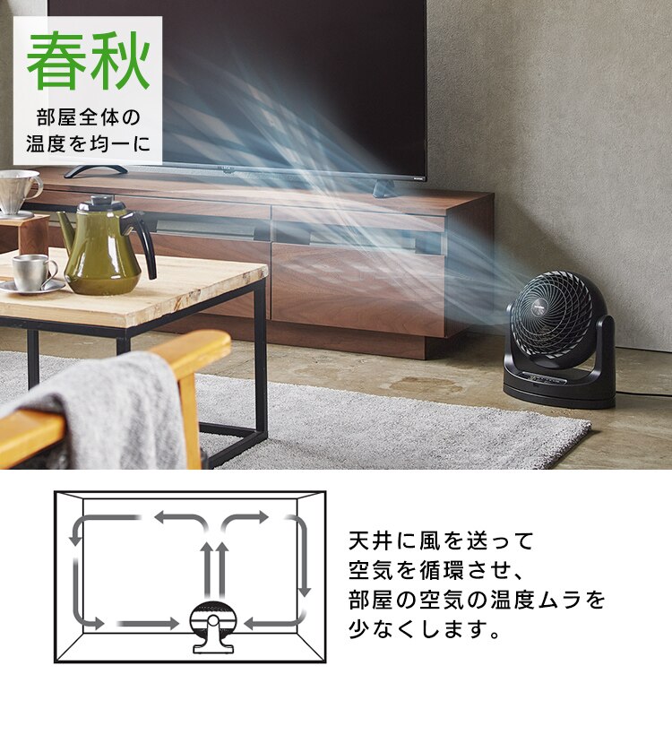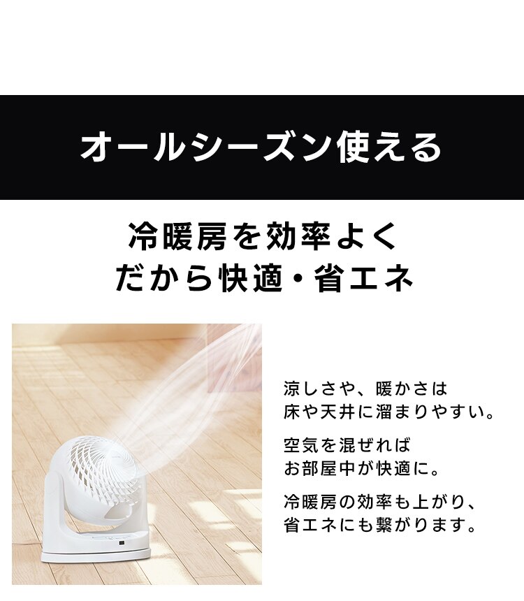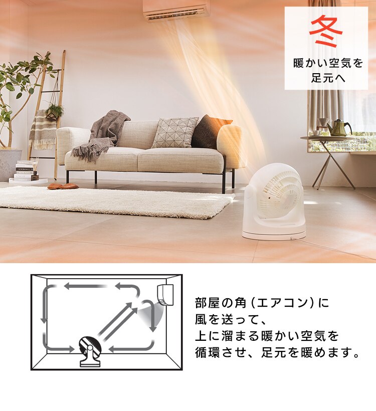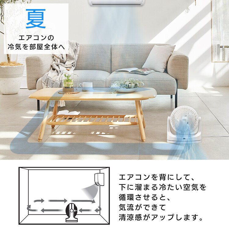 エアコンと併用して夏は冷気を部屋全体へ、冬は暖かい空気を足元へ循環し一年中使えます。