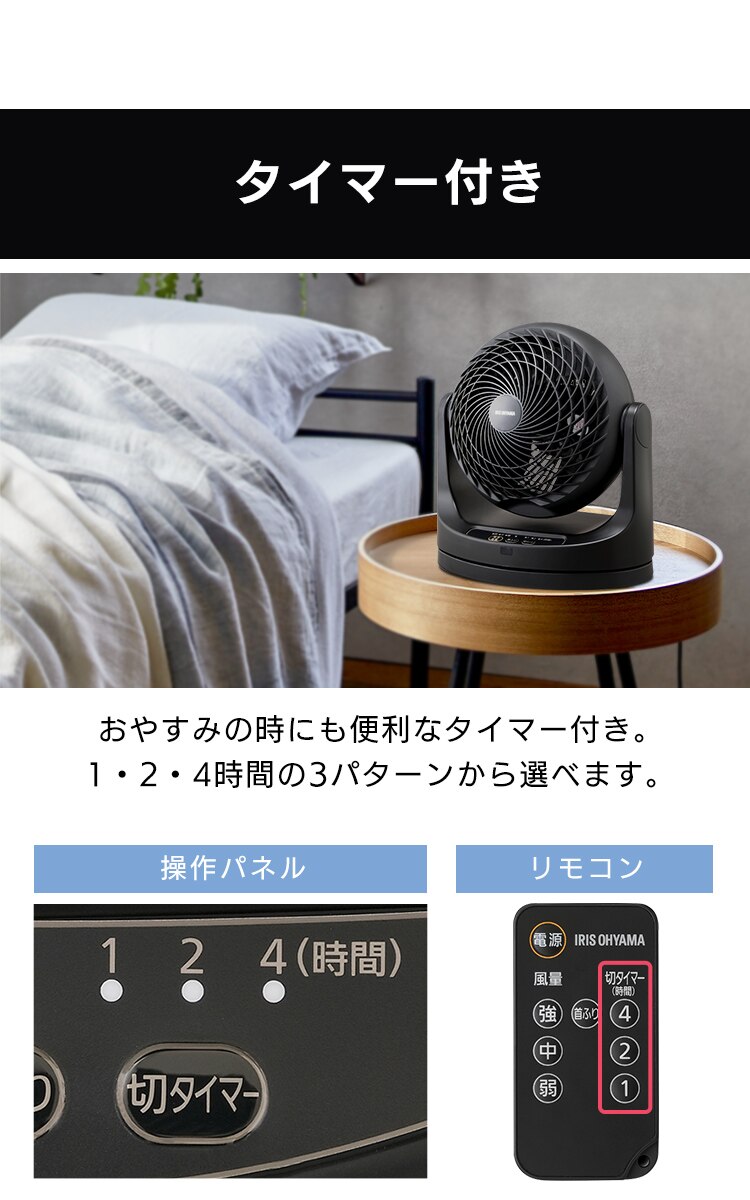 おやすみの時にも便利なタイマー付き。1・2・4時間の3パターンから選べます。