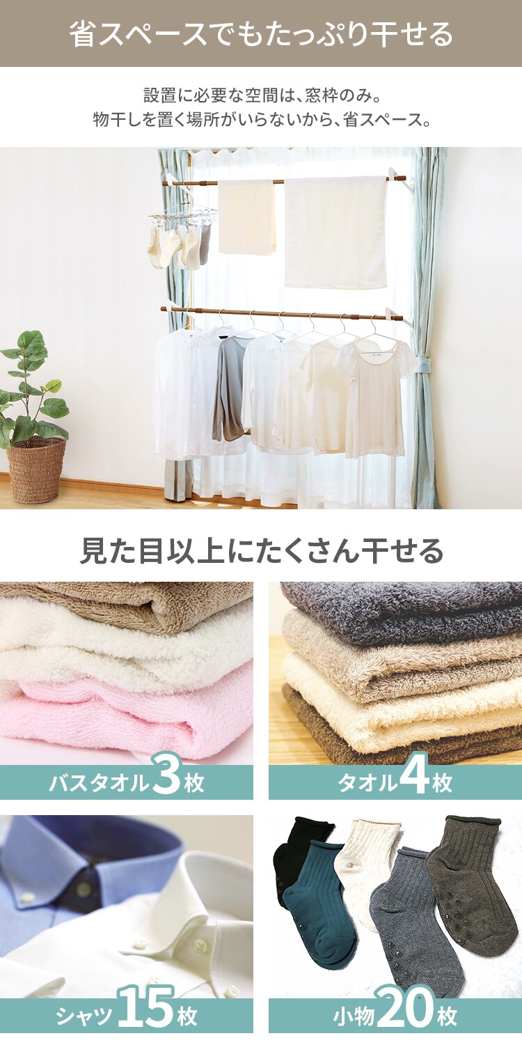 ●干す量の目安:約4人分(シャツ等15枚、バスタオル3枚、タオル4枚、小物20枚)