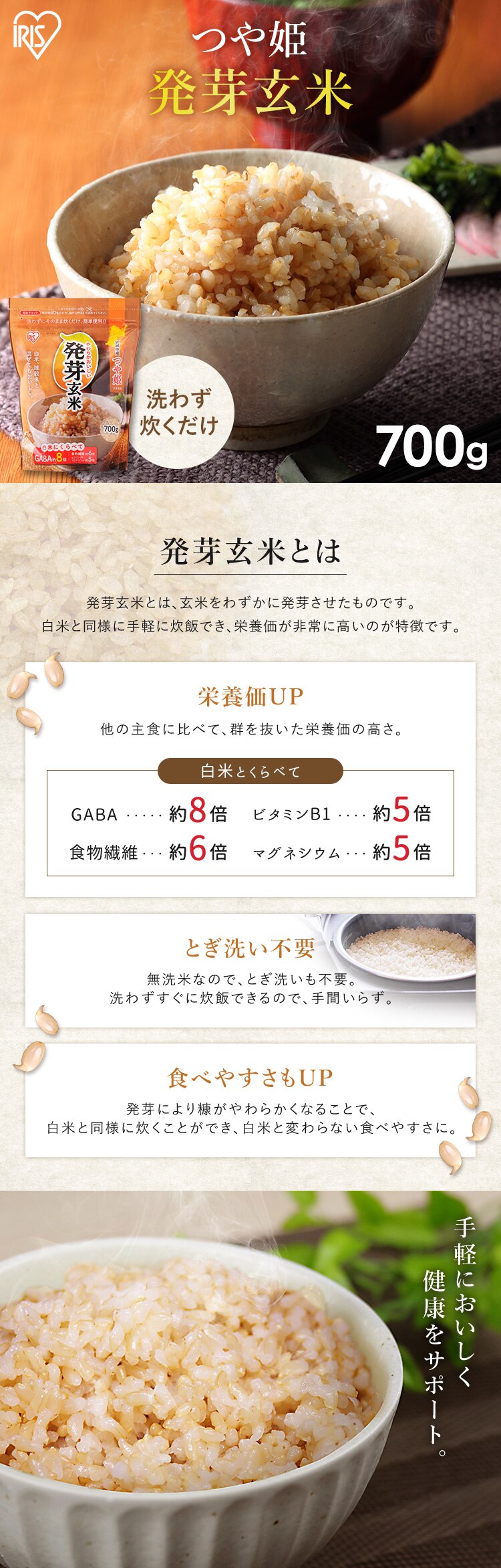 発芽玄米とは玄米をわずかに発芽させたもので、栄養価が非常に高いのが特徴です。無洗米なので、とぎ洗いも不要。