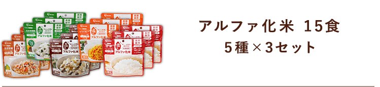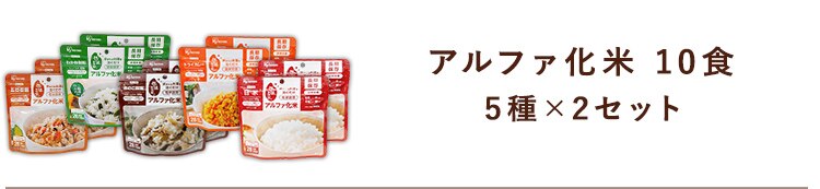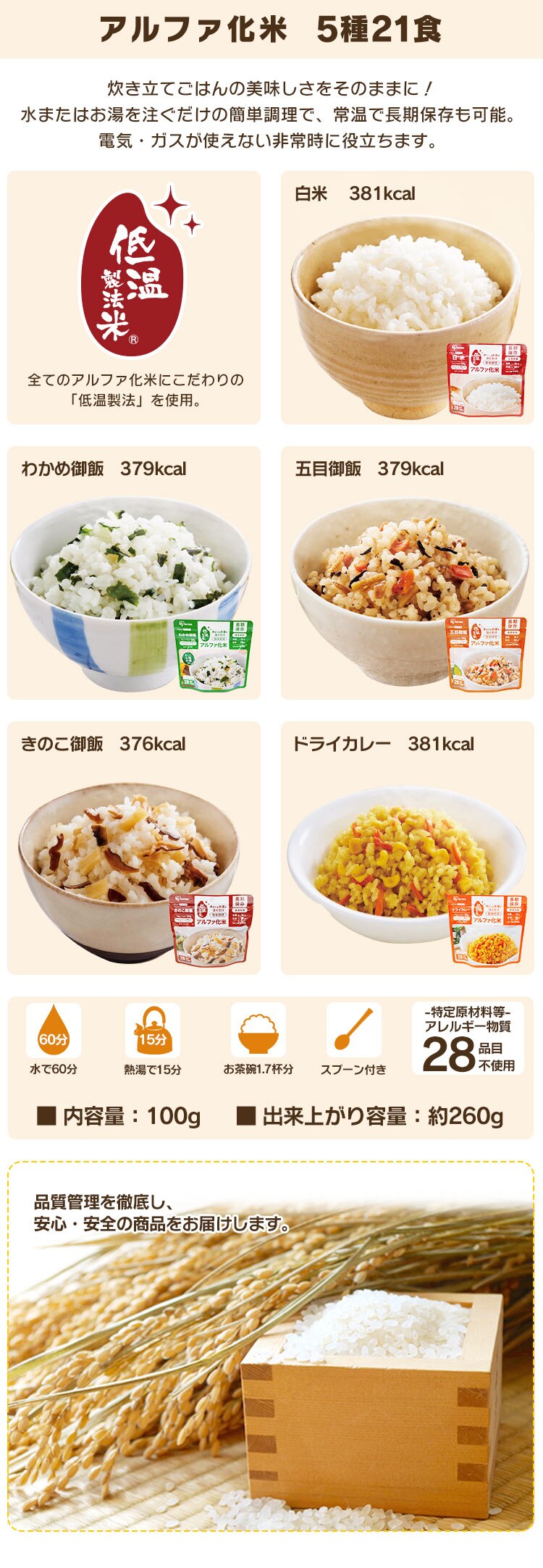 バラエティ豊かな5種類のアルファ化米は、水またはお湯を注ぐだけの簡単調理。