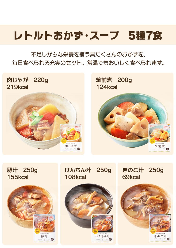 肉じゃが・豚汁などのおかず・汁物は常温でもおいしく食べられます。