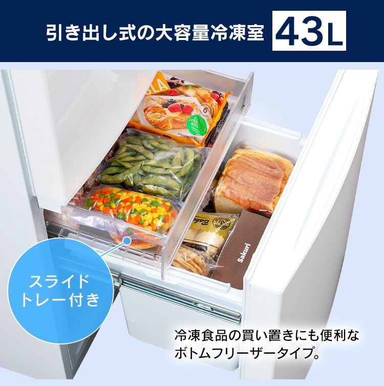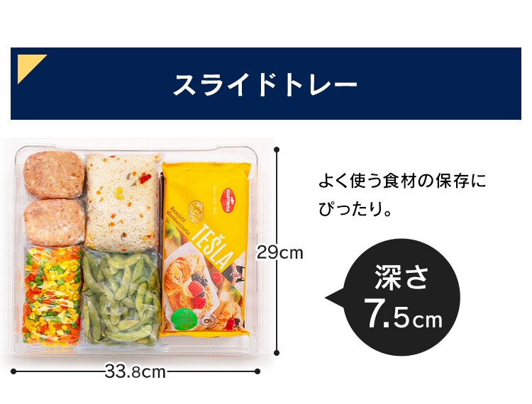 よく使う食材やアイスなどの保存にぴったりなスライドトレー付き。