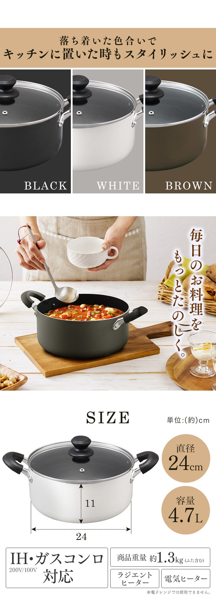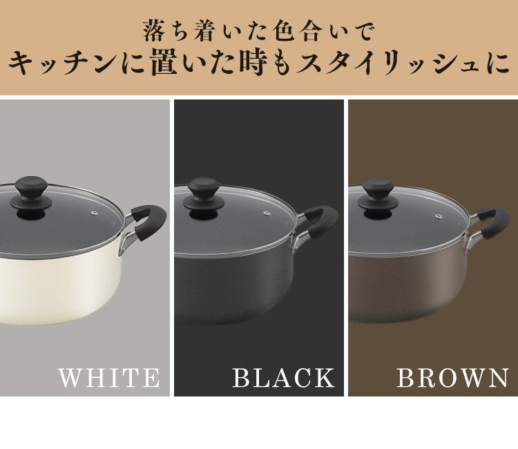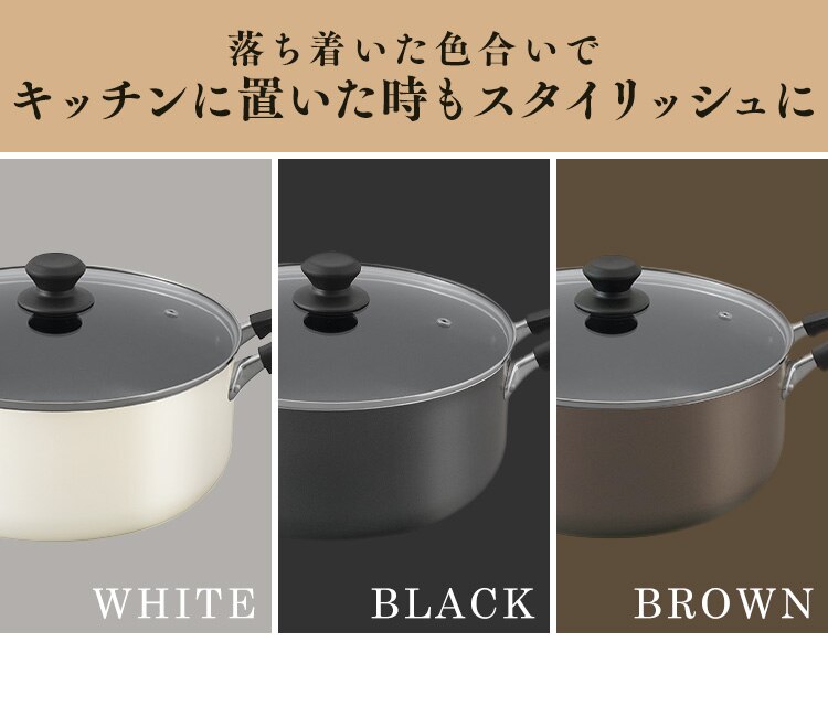 - 以前から使っていたお鍋の持ちてが焦げてしまい購入しました。以前は白でしたが今回ブラウンにしました。落ち着いた色で気に入ってます。