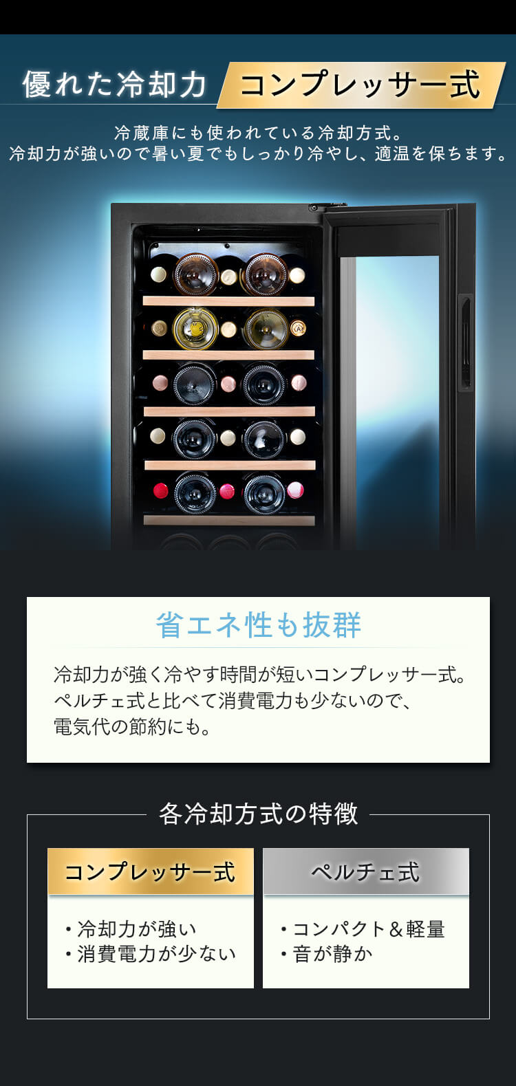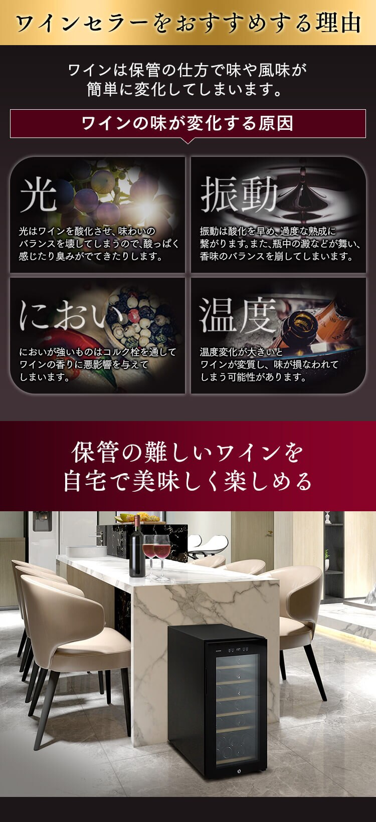 - 2月はじめに急にワインセラーが音が鳴りだし壊れました。時々復旧するも瀕死!ドメティック社のセラーで12年使用。同じものも含めて色々検討した結果、価格と省スペースでこちらに決定。音が心配でしたが夏の冷却能力に期待しコンプレッサー式を選択しました。購入時に旧セラーの廃棄と安心設置を申し込みました。事前にメール連絡があり、当日に時間についての電話があり、回収・搬入・設置共にヤマト系引越し便(旧アート)が実施してくれました。とてもスムーズに手早く、セラーの簡単な説明とコンセントを差すタイミングを教えてくれ、設置120分後に電源オン。コンセントを差しこむと電源が入ります。庫内温度17℃で、設定を12℃で待ち。居間のテレビ横に設置しましたが音は気になりません。30分ほどで指定温度に達したので冷蔵庫に一時避難のワイン達を収納。26本入れました。一段に互い違いに入れるので平行になるように注意しました。ボルドー型はすんなり収まりますがブルゴーニュ型が場所を取るので26本収納し、冷蔵庫避難の残りのワインは飲んでしまうことにしました。壊れてみて思ったのはドメティックのセラーは良かったですがお世話が大変でした。これからはコンパクトなこのセラーの本数に合わせてワイン管理をしていきます。★4個の理由はコンパクトさ・静かさと納入サービスの良さに対して。残る★の理由はこれから迎える猛暑に際しての未知の部分と、光を遮断するのにどうするか考え中によるものです。一般的に家庭でワインを楽しむ方に適しているのではないかと思います。
