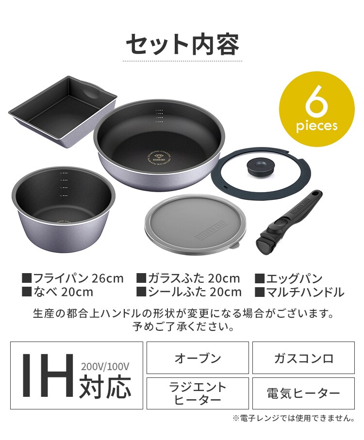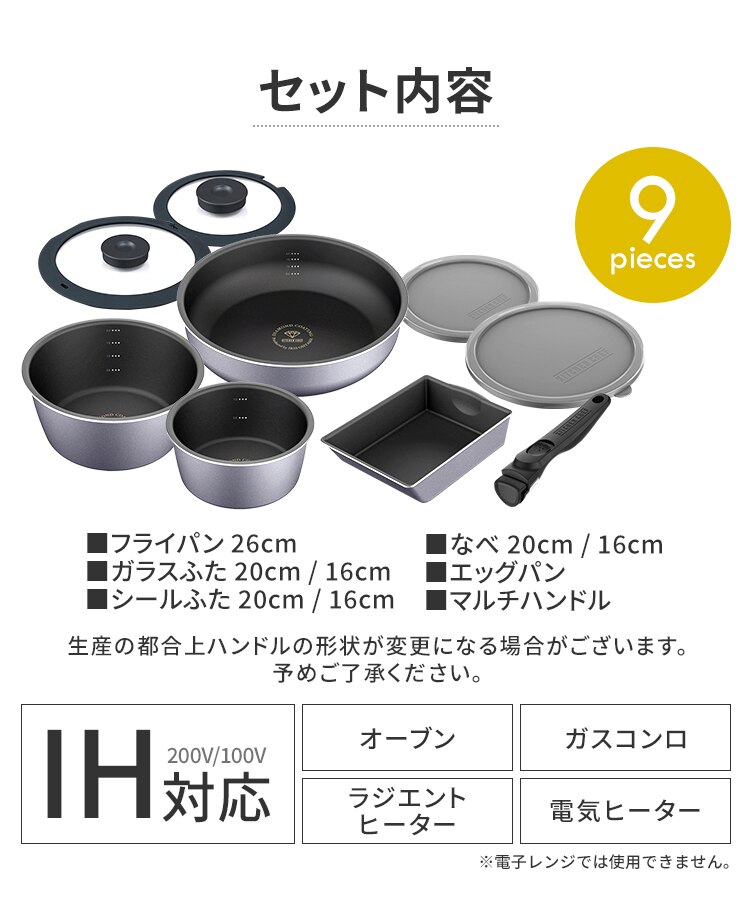 フライパン26cm、なべ16cm、なべ20cm、エッグパン、ガラスふた16cm、ガラスふた20cm、シールふた16cm、シールふた20cm、マルチハンドル
