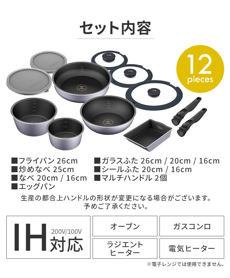 フライパン26cm、炒めなべ25cm、なべ16cm、なべ20cm、エッグパン、ガラスふた16cm、ガラスふた20cm、ガラスふた26cm、シールふた16cm、シールふた20cm、マルチハンドル×2