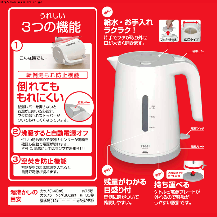 お湯が沸騰すると自動でスイッチが切れる自動電源オフ機能があるので安心です。
