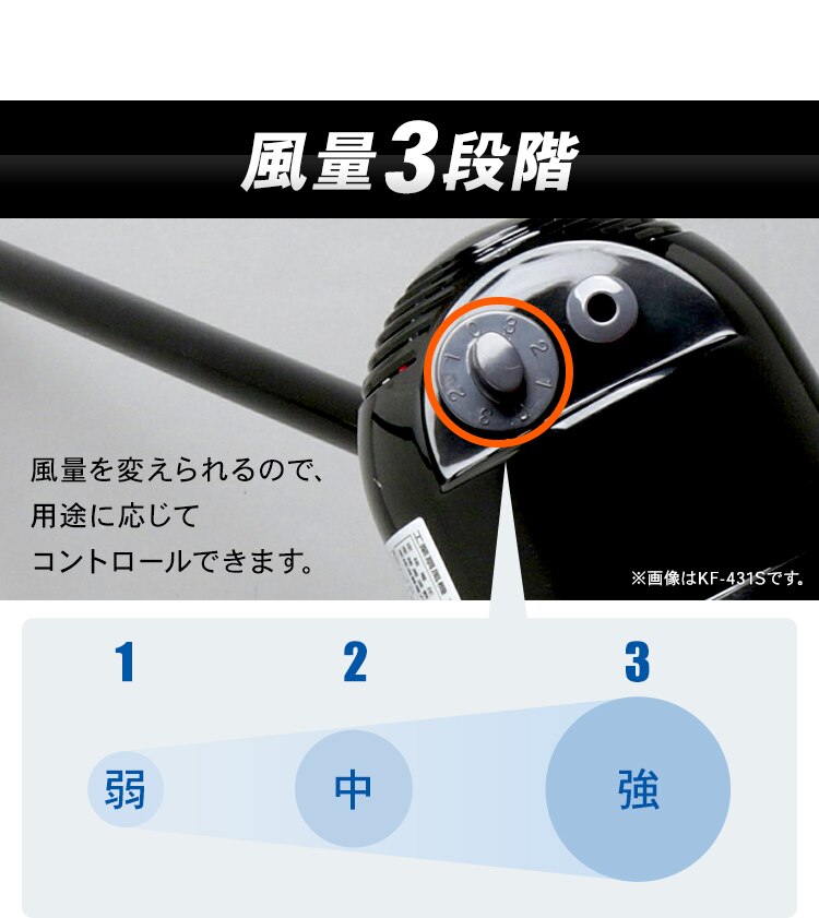 左右自動首振り機能付きで、風量調節は3段階「強(3)・中(2)・弱(1)」です。