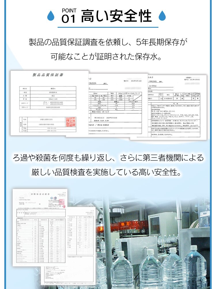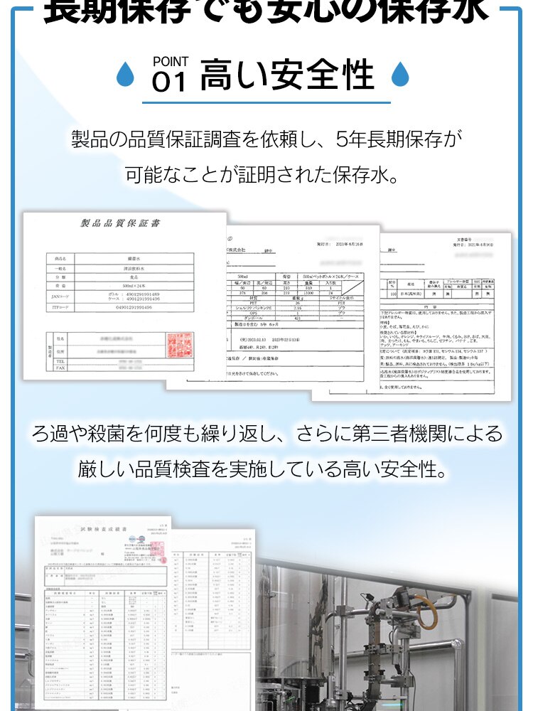 製品の品質保証調査を依頼し、5年長期保存が可能なことが証明された保存水です。