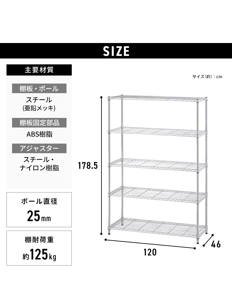 - スチールラック 幅120cm メタルラック シンプル 5段 SMR-1218J シルバー (ポール直径25mm・棚板5枚)
