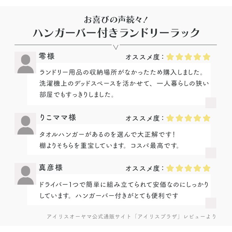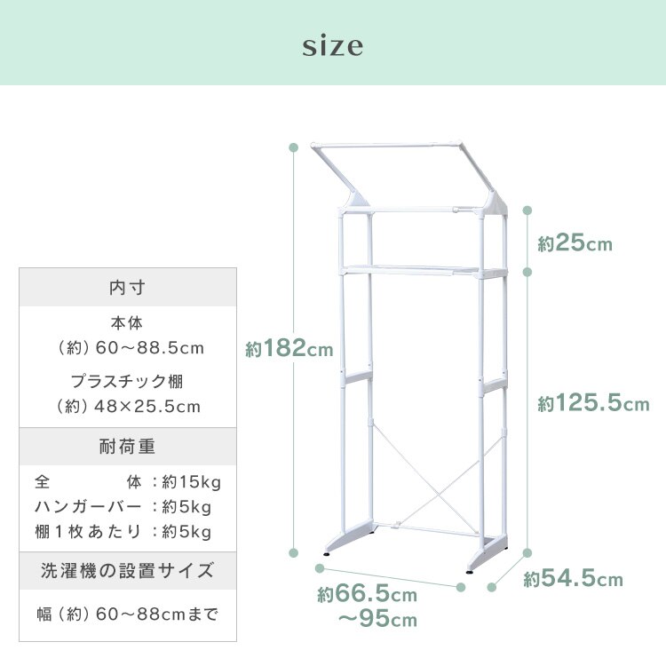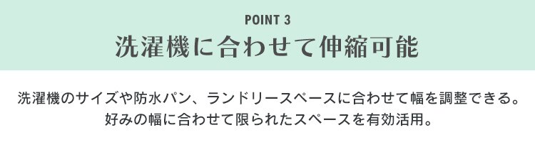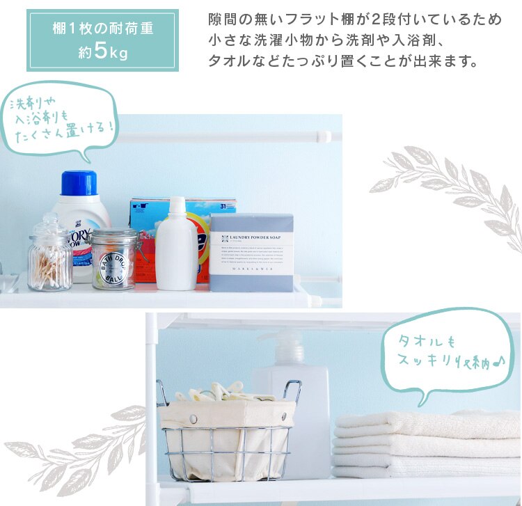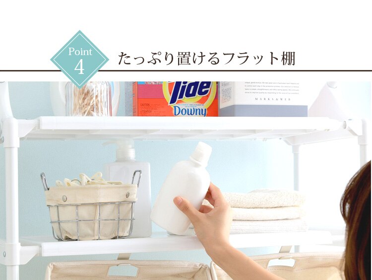 - ずっと洗濯機の上の空間を有効活用したいと思っていて、買い替えに合わせて購入しました。組み立ても一人で問題なく、洗濯機周りがスッキリしました。