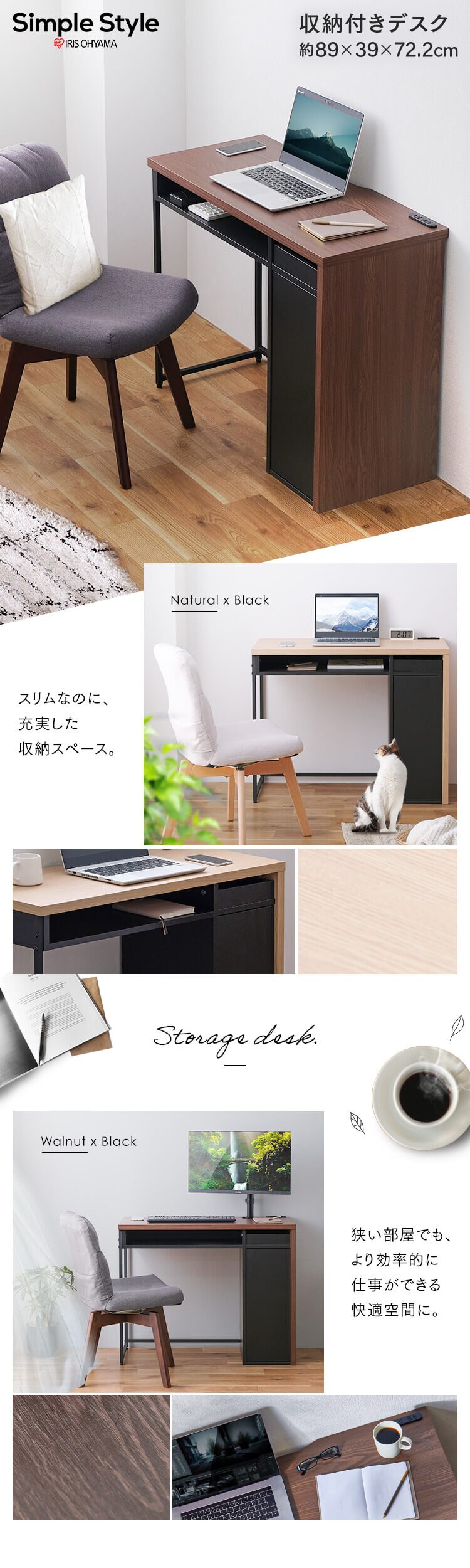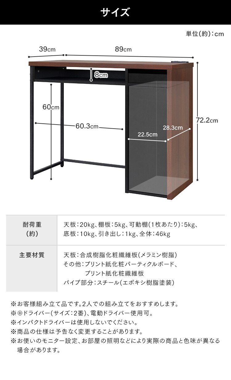 - 机 デスク 幅89cm スリム 収納付き SDK-890 ウォールナット/ブラック