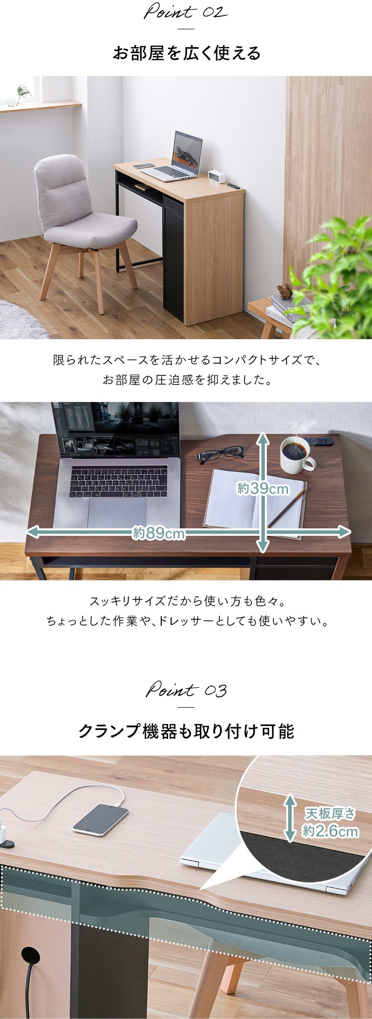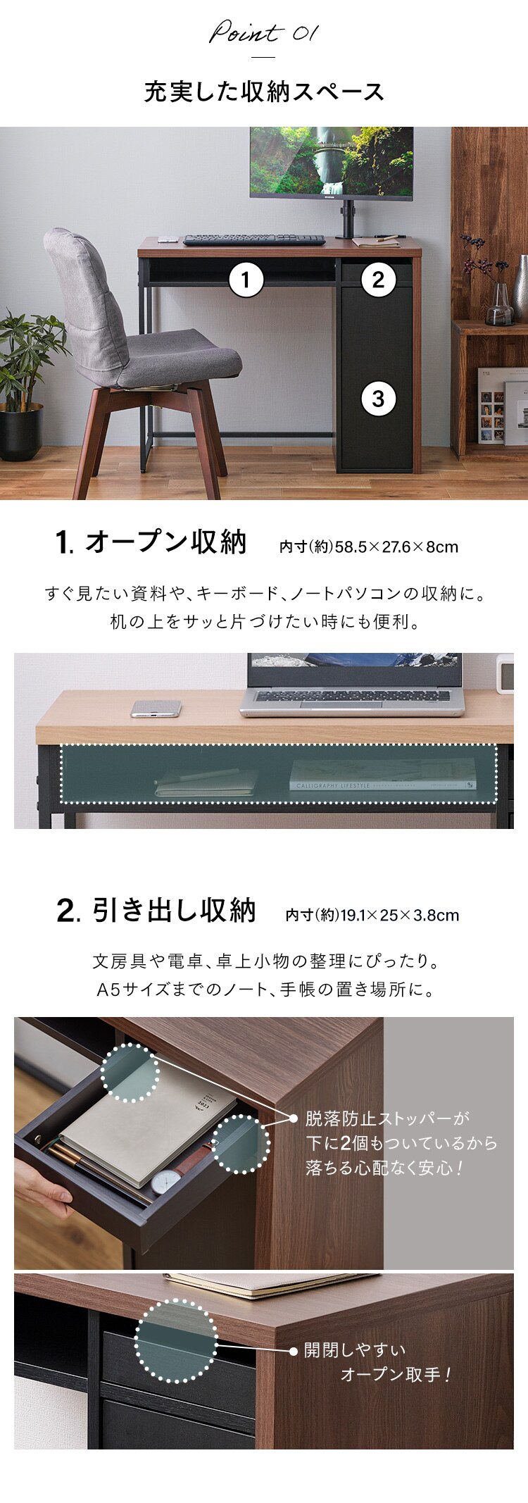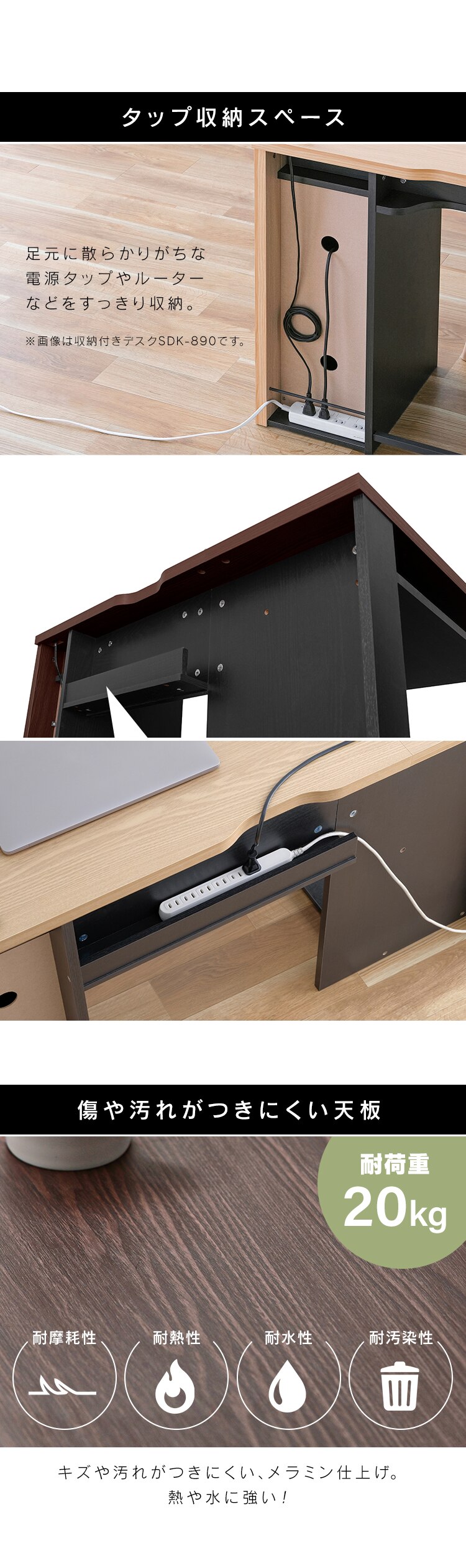 ・コードスリット:壁にぴったりとデスクを置ける。配線もすっきり。