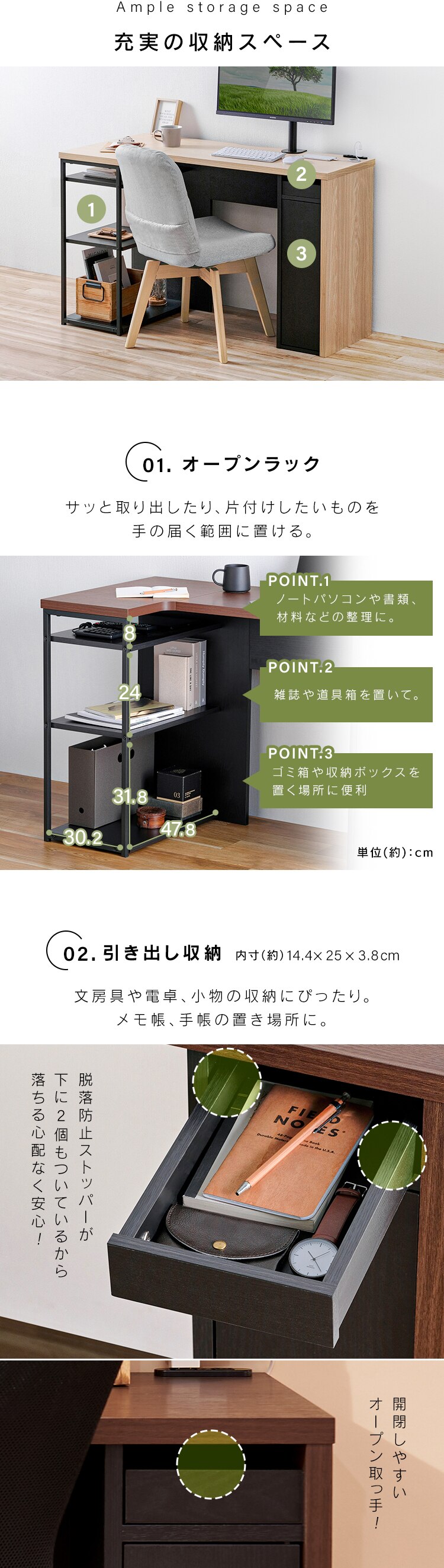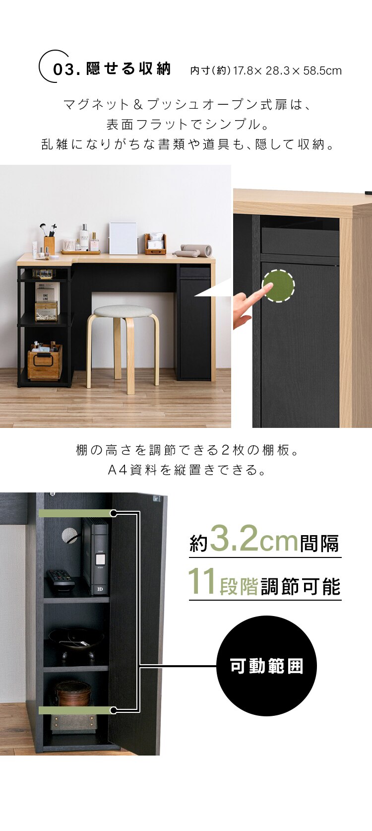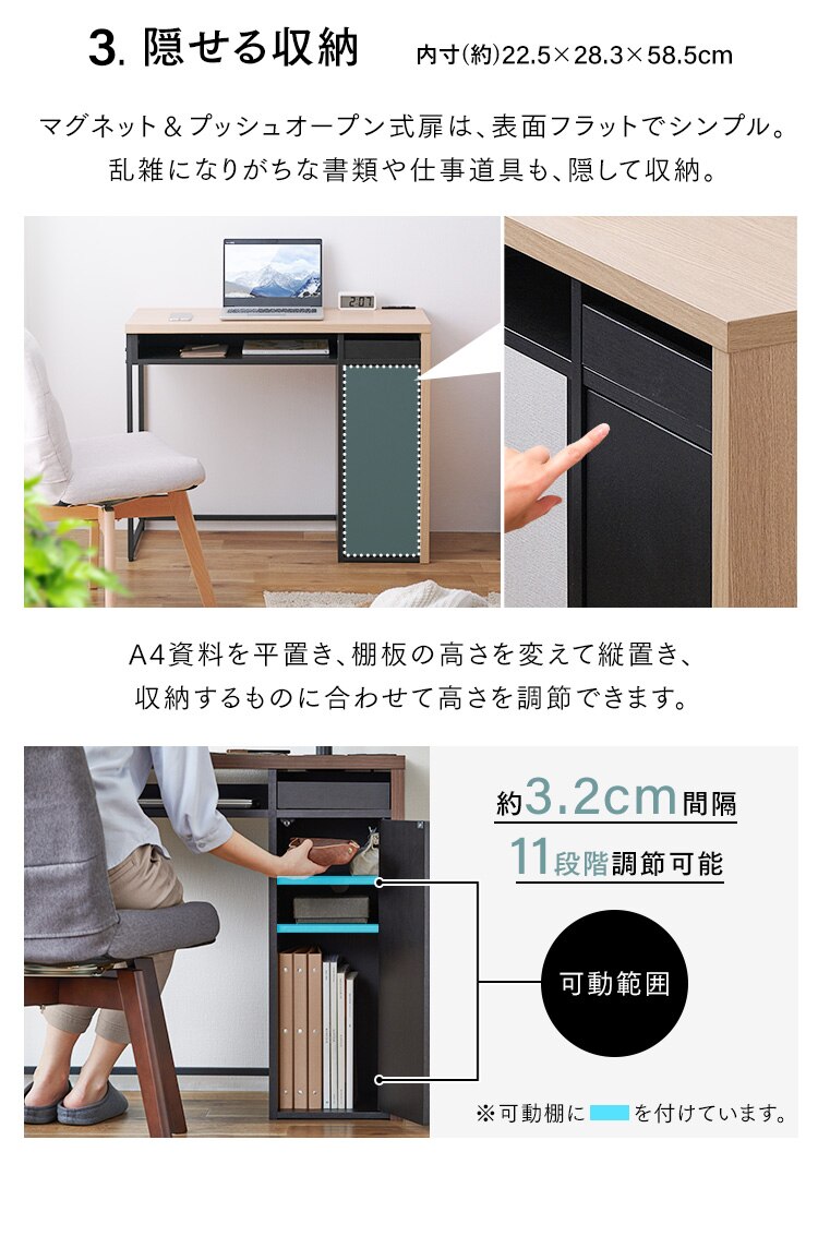 上段:ノートパソコンや書類、材料などの整理に。
