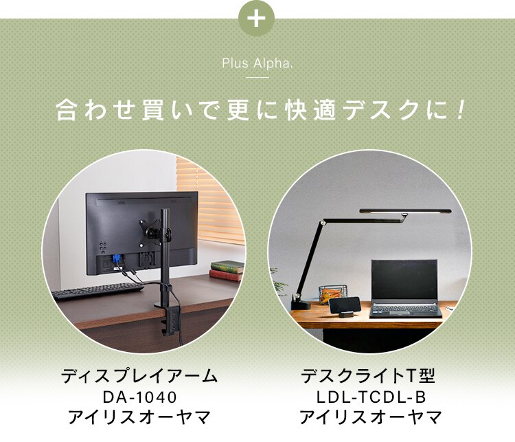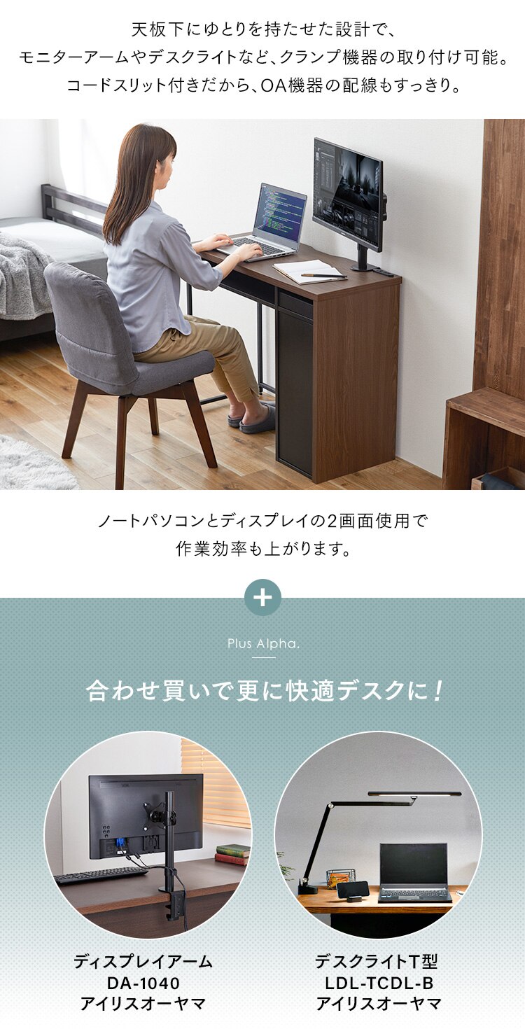 天板下にゆとりを持たせた設計で、モニターアームやデスクライトなどクランプ機器の取り付け可能。