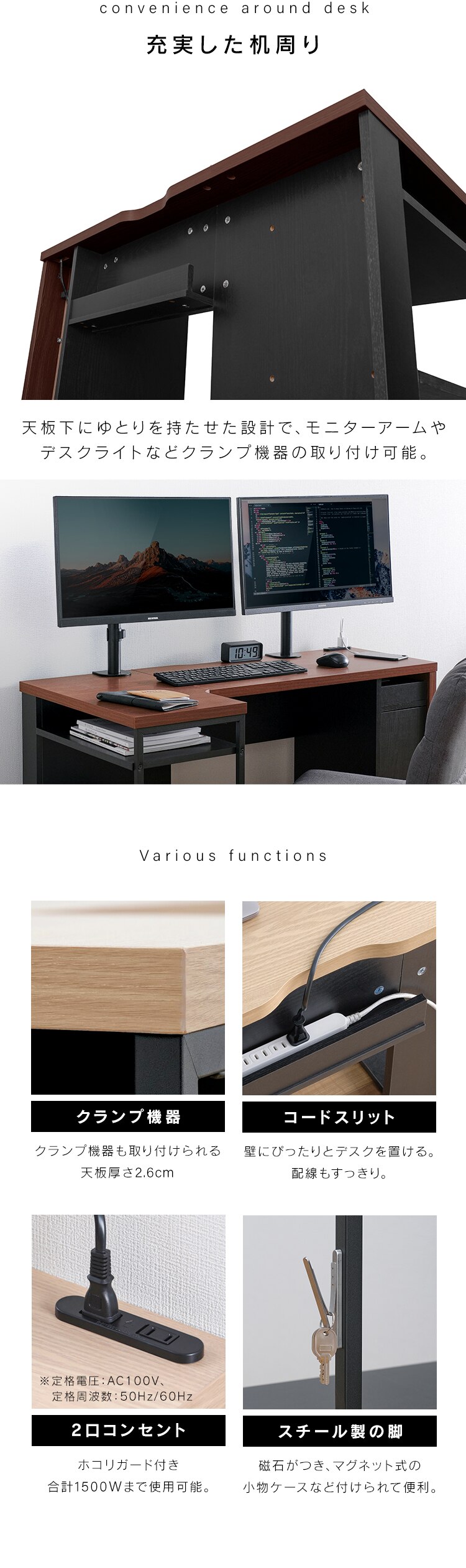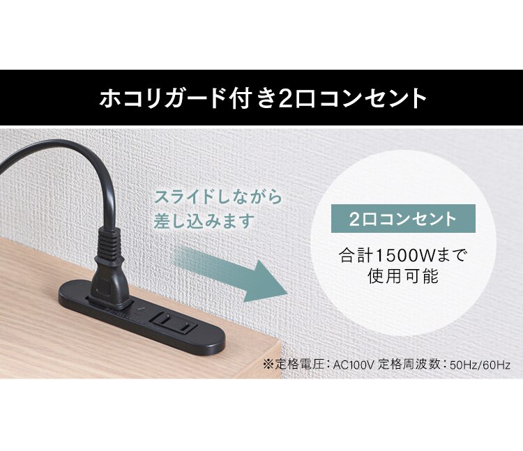 ・2口コンセント:ホコリガード付き、合計1500Wまで使用可能。(※定格電圧:AC100V、定格周波数:50/60Hz。)