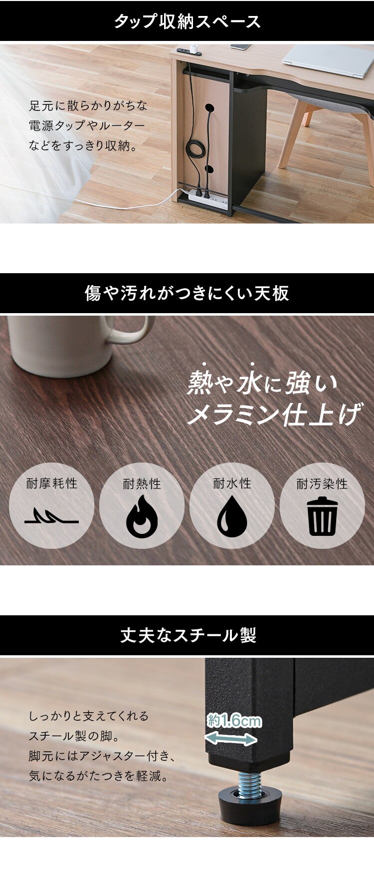 天板:合成樹脂化粧繊維板(メラミン樹脂)