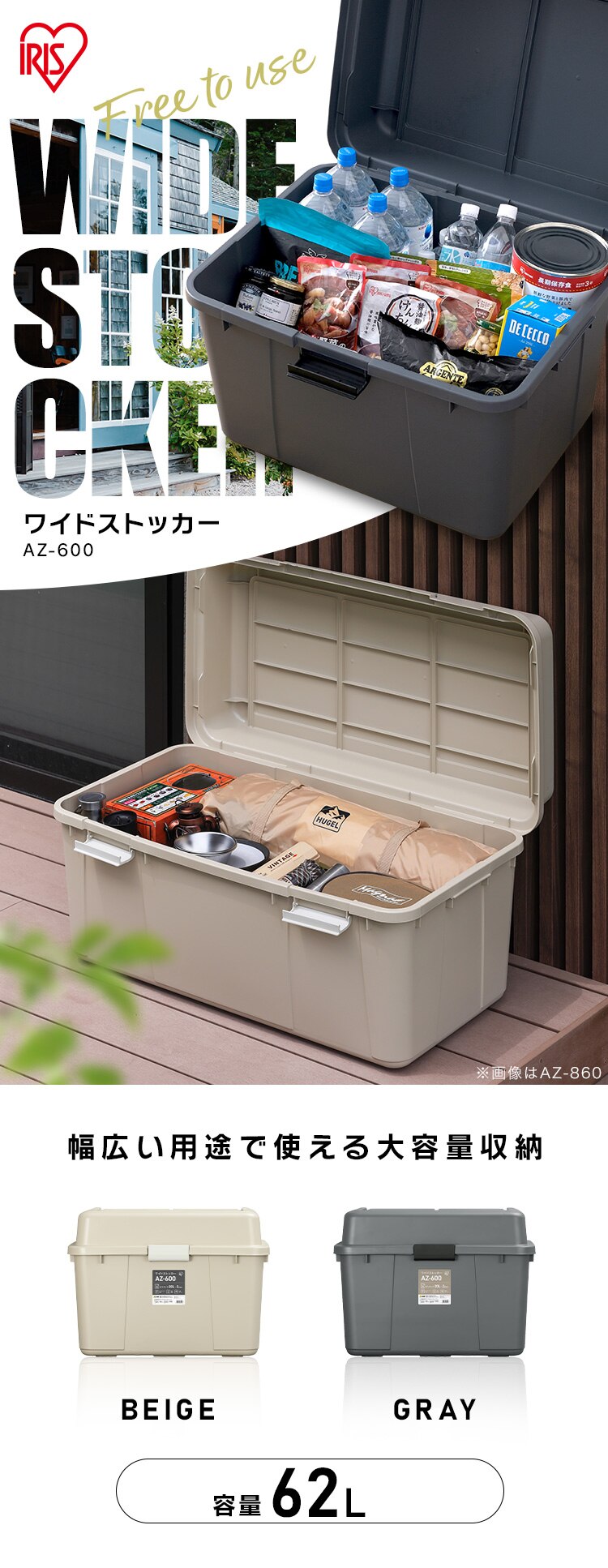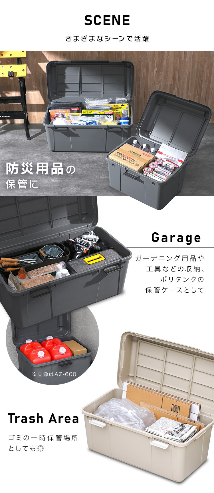 ガーデニング用品の収納や防災用品・食品のストックなど、幅広い用途で使用できます。