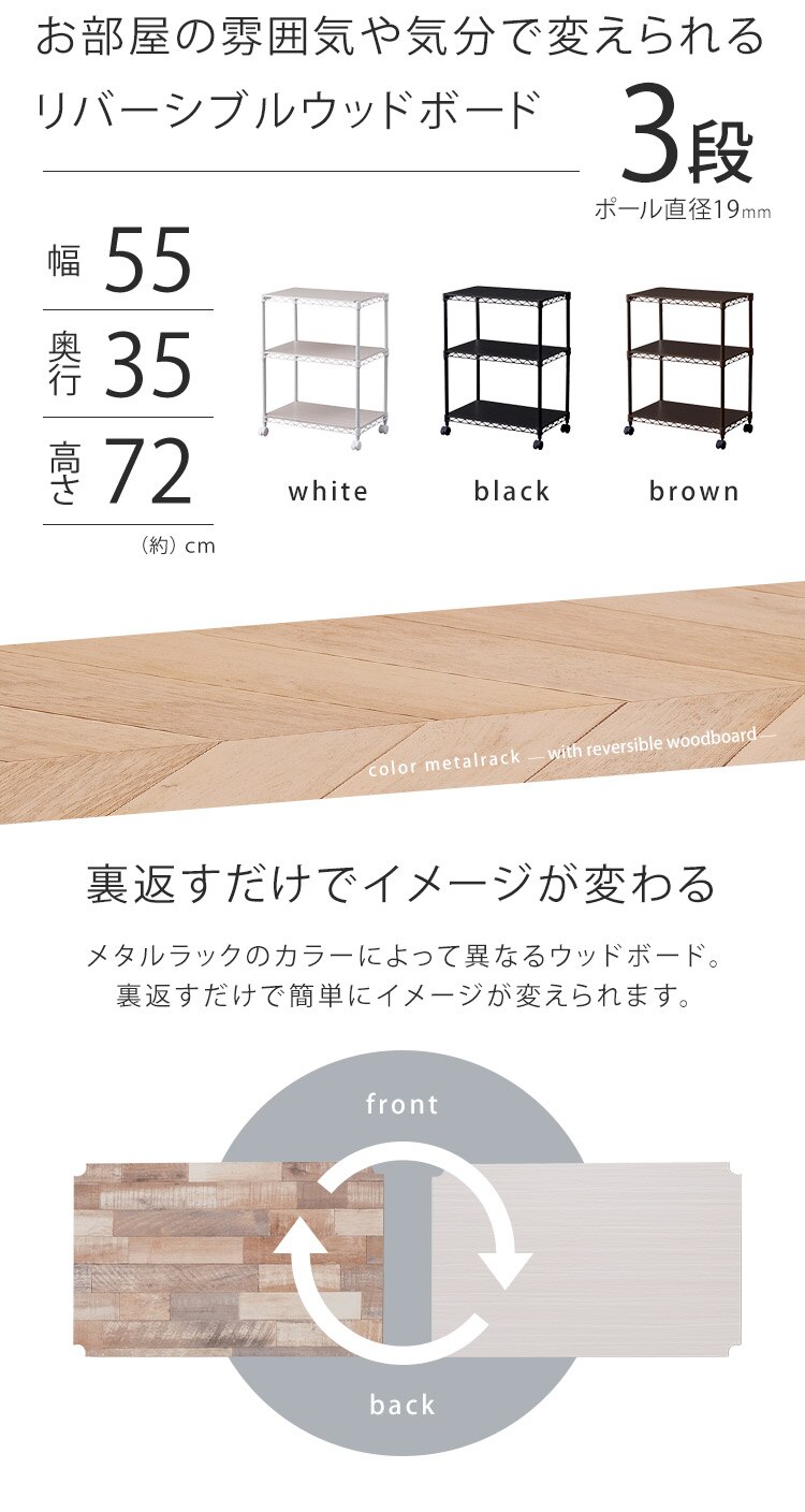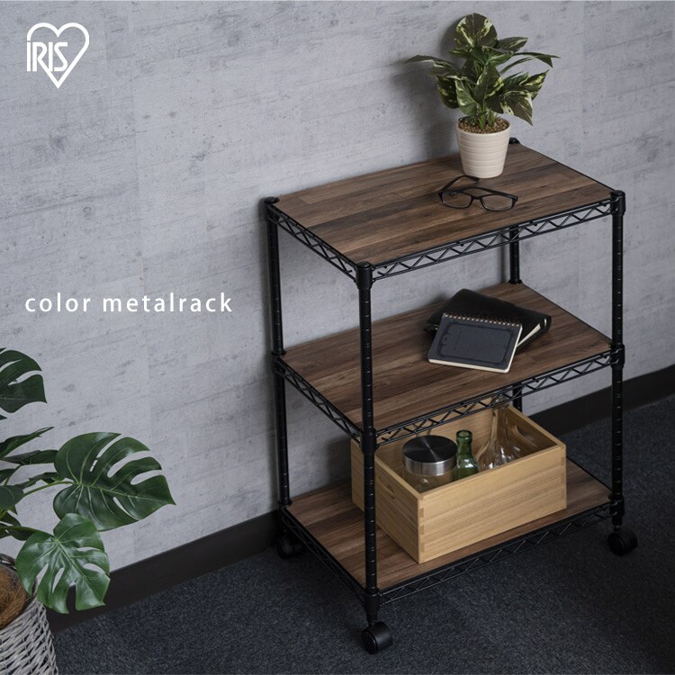 - スチールラック 幅55cm 3段 カラーメタルラック ウッドボード付き CMM-55073B ブラウン