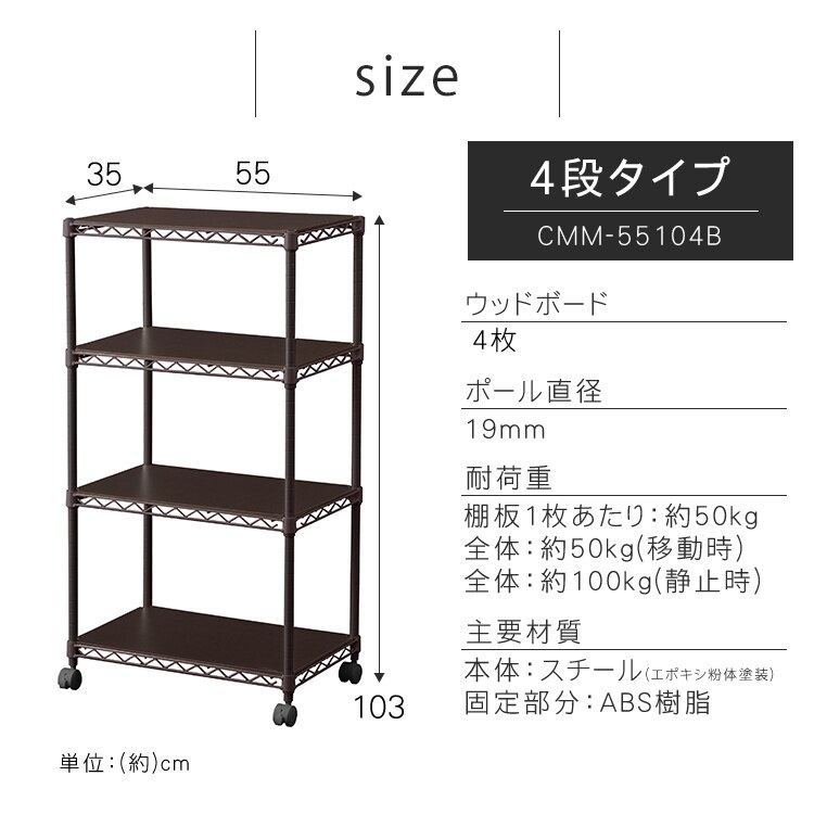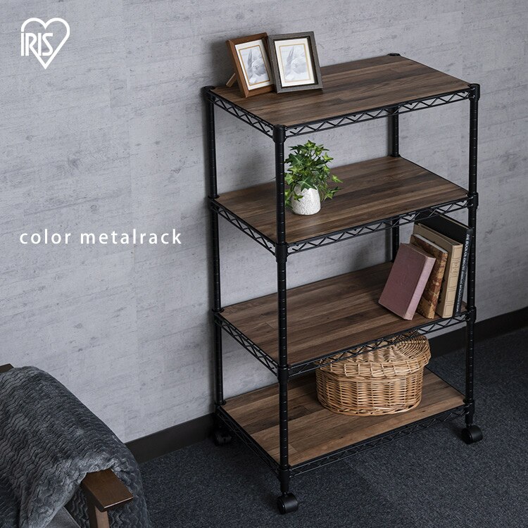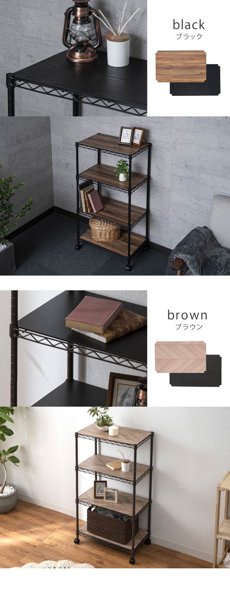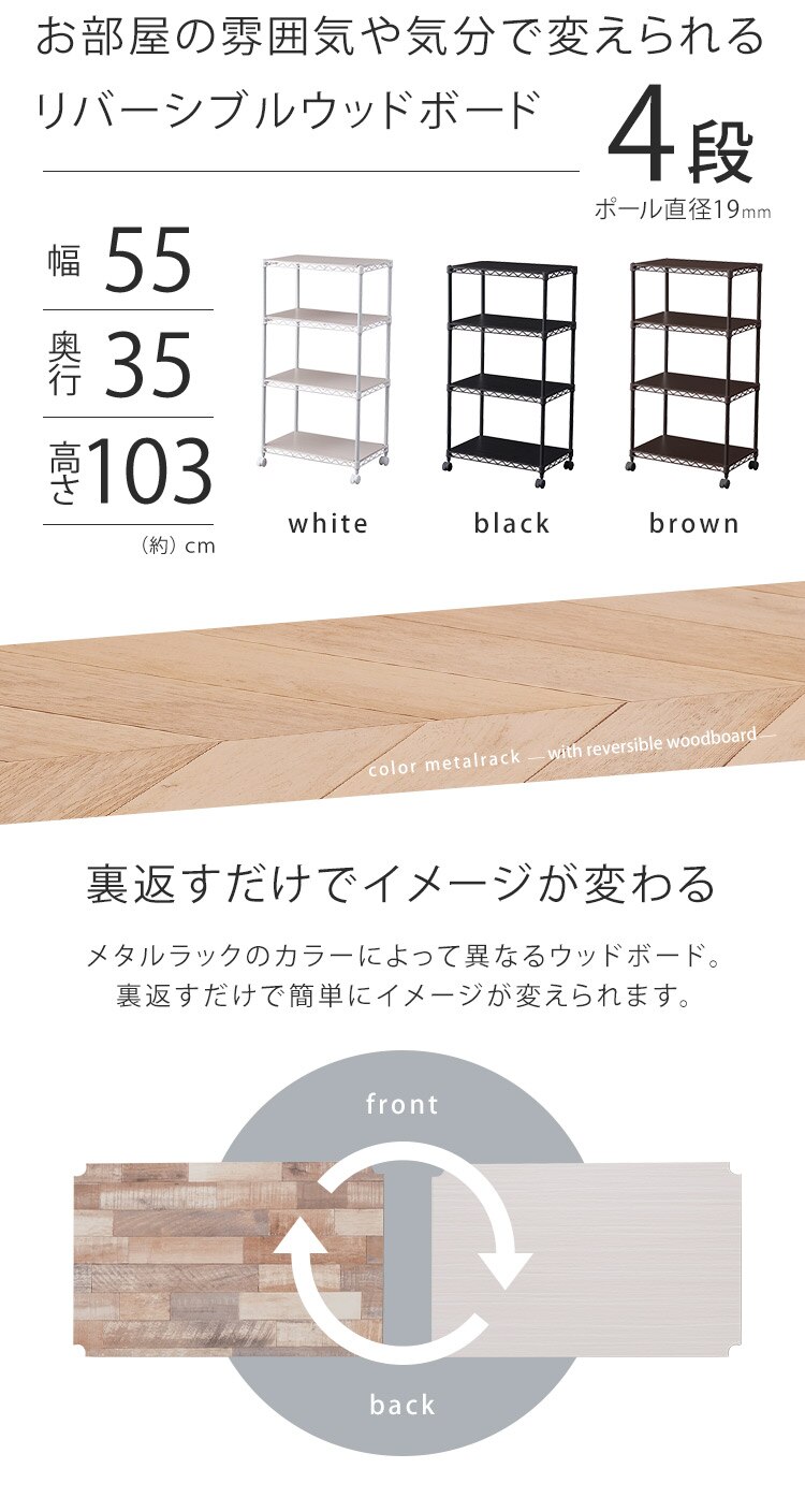 スチールラック 幅55cm 4段 カラーメタルラック ウッドボード付き CMM-55104B ブラック