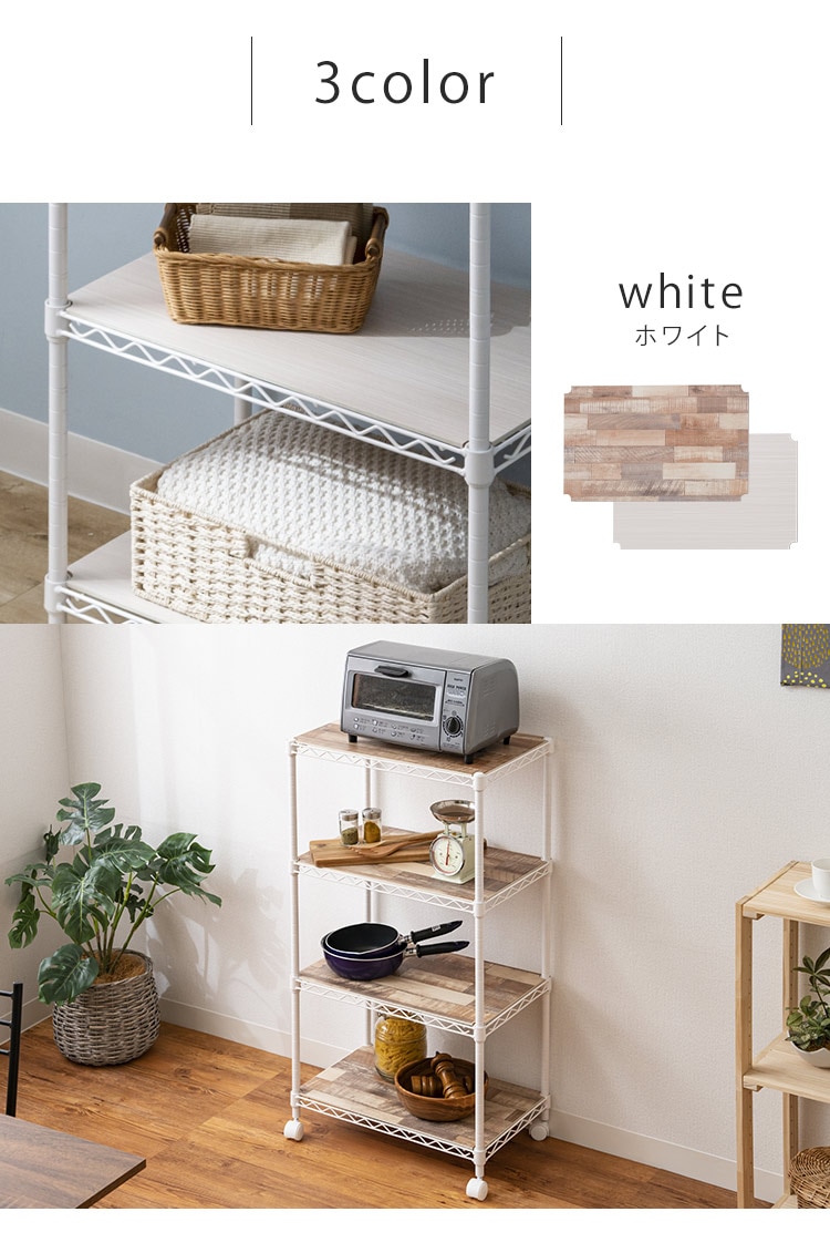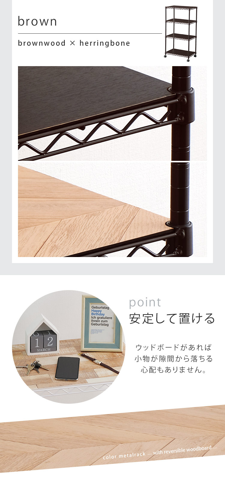 お部屋の雰囲気に合わせて選べる「リバーシブルウッドボート付き」マットカラーのメタルラック。