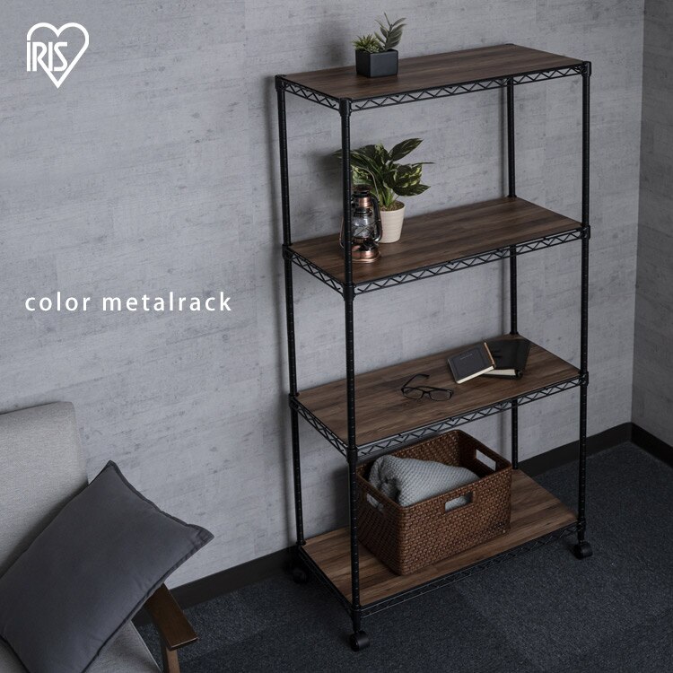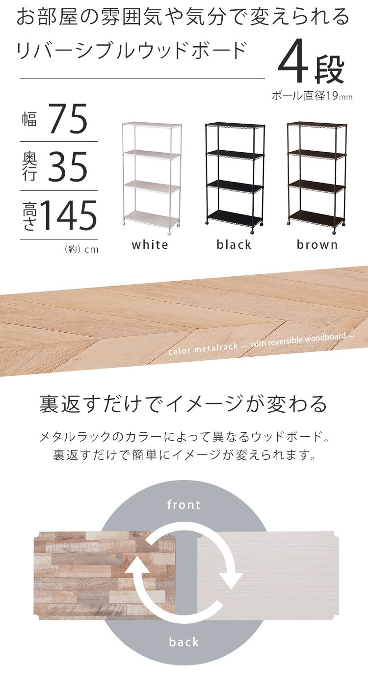 - スチールラック 幅75cm 4段 カラーメタルラック ハイタイプ ウッドボード付き CMM-75144B ブラック