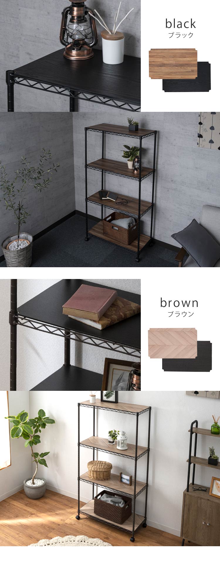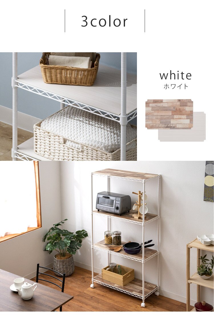 お部屋の雰囲気に合わせて選べる「リバーシブルウッドボート付き」マットカラーのメタルラック。
