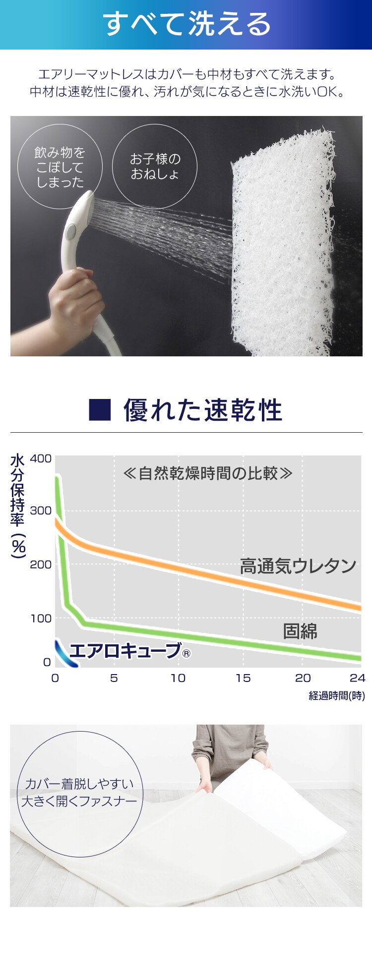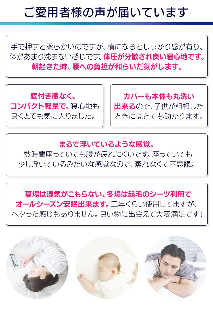 従来のマットレスに比べてクッション性、体圧分散性、通気性、耐久性に優れた、丸洗い可能な素材です。