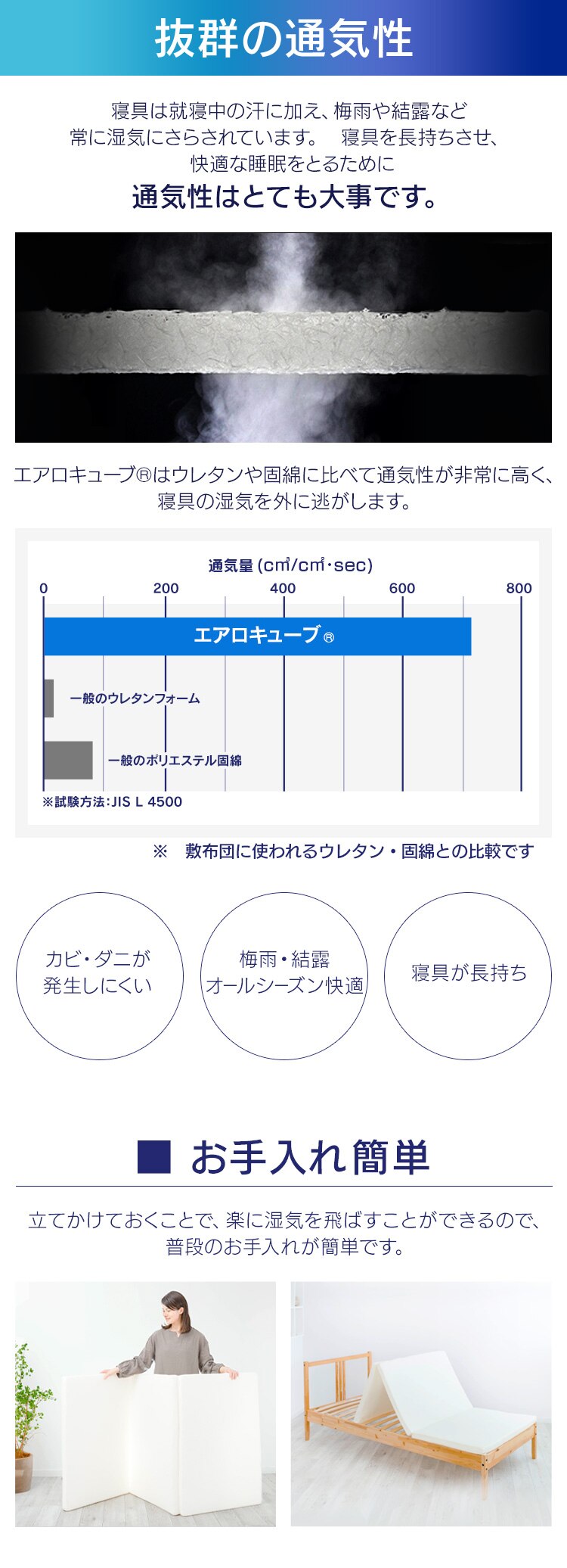 繊維の隙間から湿気を外へ逃がすため、寝汗がマットレスにこもりにくくなっています。