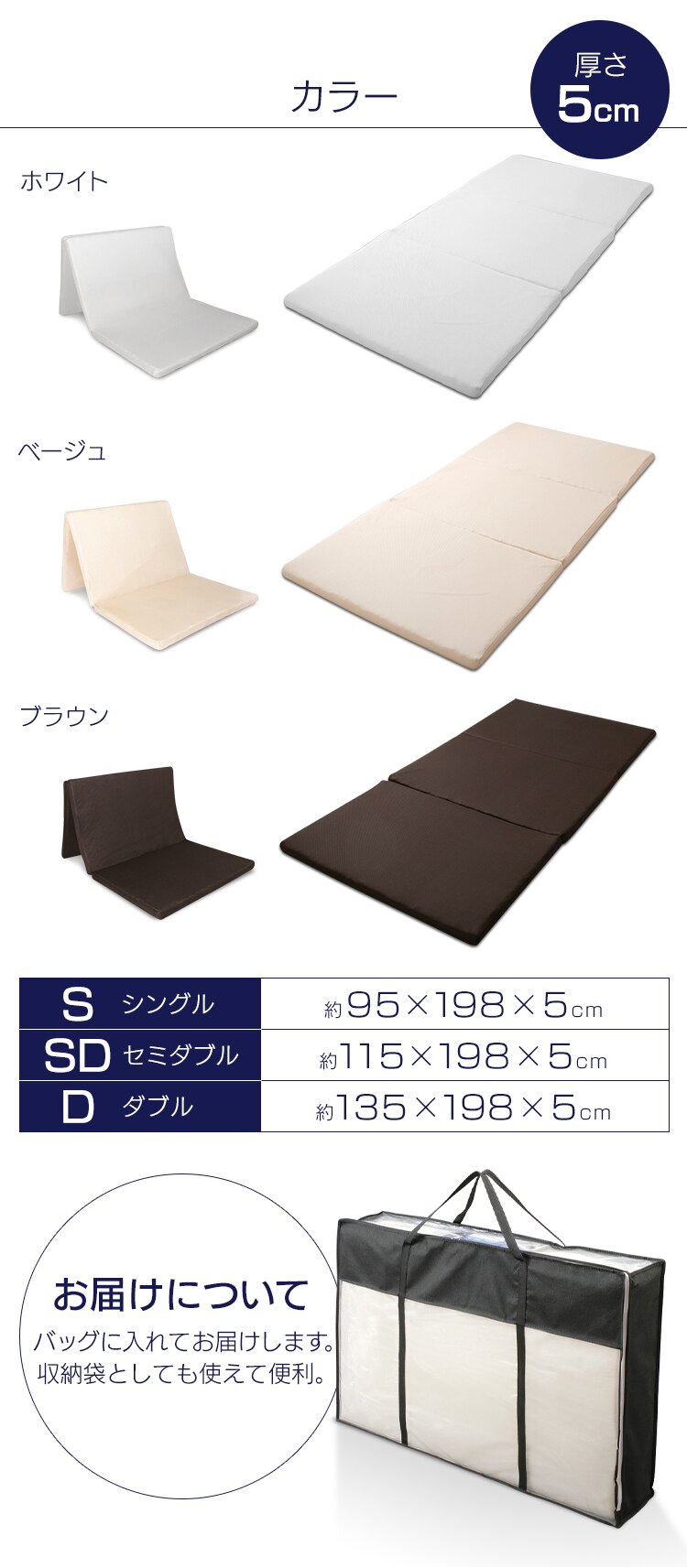 - マットレス ダブル エアリーマットレス 丸ごと洗える 抗菌防臭 三つ折り 厚さ5cm MAR-D ベージュ